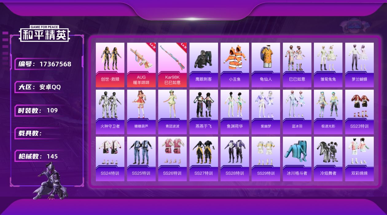 [17367568]安卓 手Q-2粉装-7特效枪-0载具-1粉色飞行器-43057热力值-8王牌印记-109套装-145枪皮 【热门品类】:套装-小丑鱼,套装-龟仙人 【粉色套装】:套装-创世·救赎,角色-罪夜之冕 【粉色枪皮等级】:AUG-暖羊咩咩(五级),ACE32-萌骑漫游(二级),AKS-74U-森灵之息(四级),Kar98K-巳巳如意(五级),Mk14-福马献瑞(五级),AA12-G-萌骑幻想(四级),燃烧瓶-天降桃花(四级) 【粉色枪皮】:AUG-暖羊咩咩,ACE32-萌骑漫游,AKS-74U-森灵之息,Kar98K-巳巳如意,Mk14-福马献瑞,AA12-G-萌骑幻想,燃烧瓶-天降桃花 【粉色飞行器】:萌物绒绒飞行器 【粉色降落伞】:洛神天依降落伞,猪猪侠降落伞,繁龙极客降落伞,绝色倾城降落伞,江南烟雨降落伞,精灵梦叶罗丽降落伞,忍者神龟降落伞,临安公主降落伞,脆鲨七海降落伞,动力核心降落伞,千仞雪降落伞 【稀有套装】:套装-龟仙人,套装-巳巳如意,套装-马上有钱,套装-雏菊兔兔,套装-萝兰蝴蝶,套装-火种守卫者,套装-糖糖葫芦,套装-青团波波,套装-燕燕于飞,套装-鱼渊荷华,套装-紫幽梦,套装-蓝冰羽,套装-极速光影,套装-雨过天青,套装-红釉青花 【稀有枪皮】:AKM-霓虹街区,AKM-龙的传人,SCAR-L-夜灯,SCAR-L-红色方程式,M416-糯团青竹,M416-蓝色火焰,GROZA-影袭,AUG-耀粉歌者,QBZ-洛神天依,M762-天降萌叽,AC-VAL-天降萌叽,AC-VAL-快闪甜心,蜜獾-天降萌叽,UZI-啾咪啾咪,UZI-天降萌叽,UZI-炫彩节奏,UZI-红色方程式,UMP45-夜灯,UMP45-涂山之恋,UMP45-炫光之旅,Vector-焰鹰斗篷,Vector-彩虹符号,汤姆逊-天降萌叽,汤姆逊-炫彩节奏,汤姆逊-耀粉歌者,P90-倾城蜜语,P90-快闪甜心,P90-巳巳如意,Kar98K-彩虹符号,AWM-焰鹰斗篷,VSS-彩虹符号,莫辛纳甘-蜜语绒猫,M417-惊鸿侠骨,MK20-H-快闪甜心,M200-惊鸿侠骨,S686-彩虹符号,S686-雪月幻音,S686-巳巳如意,S686-千金淑猫,S12K-玩趣呆呆,S12K-夜灯,DBS-焰鹰斗篷,DBS-第五大道,AA12-G-炫光之旅,M249-彩虹符号,M249-莲影清波,DP-28