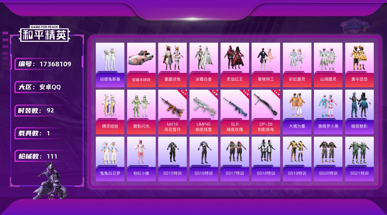 [17368109]【1439】安卓 手Q-9粉装-4特效枪-1载具-3粉色飞行器-43397热力值-7王牌印记-92套装-111枪皮