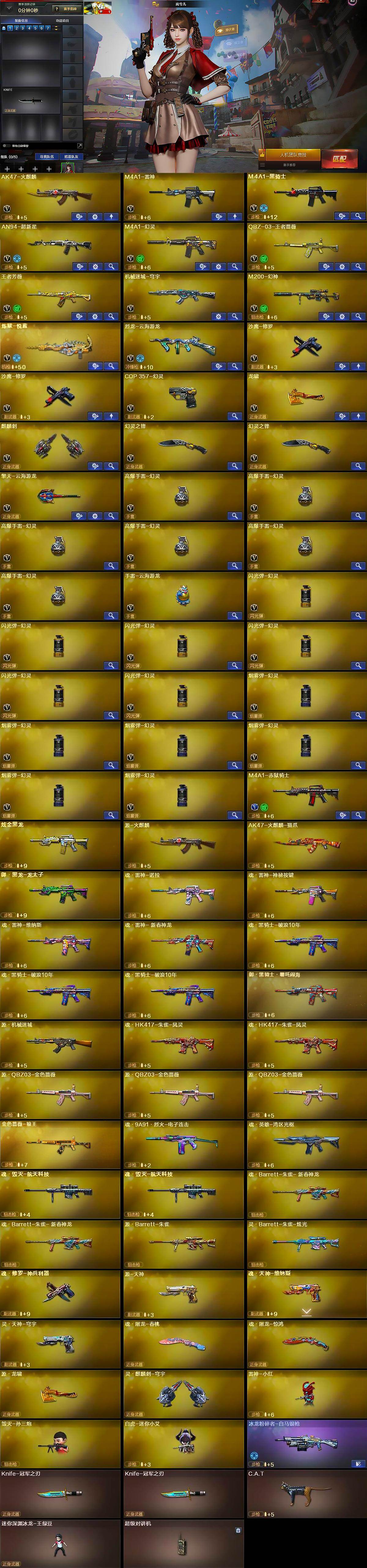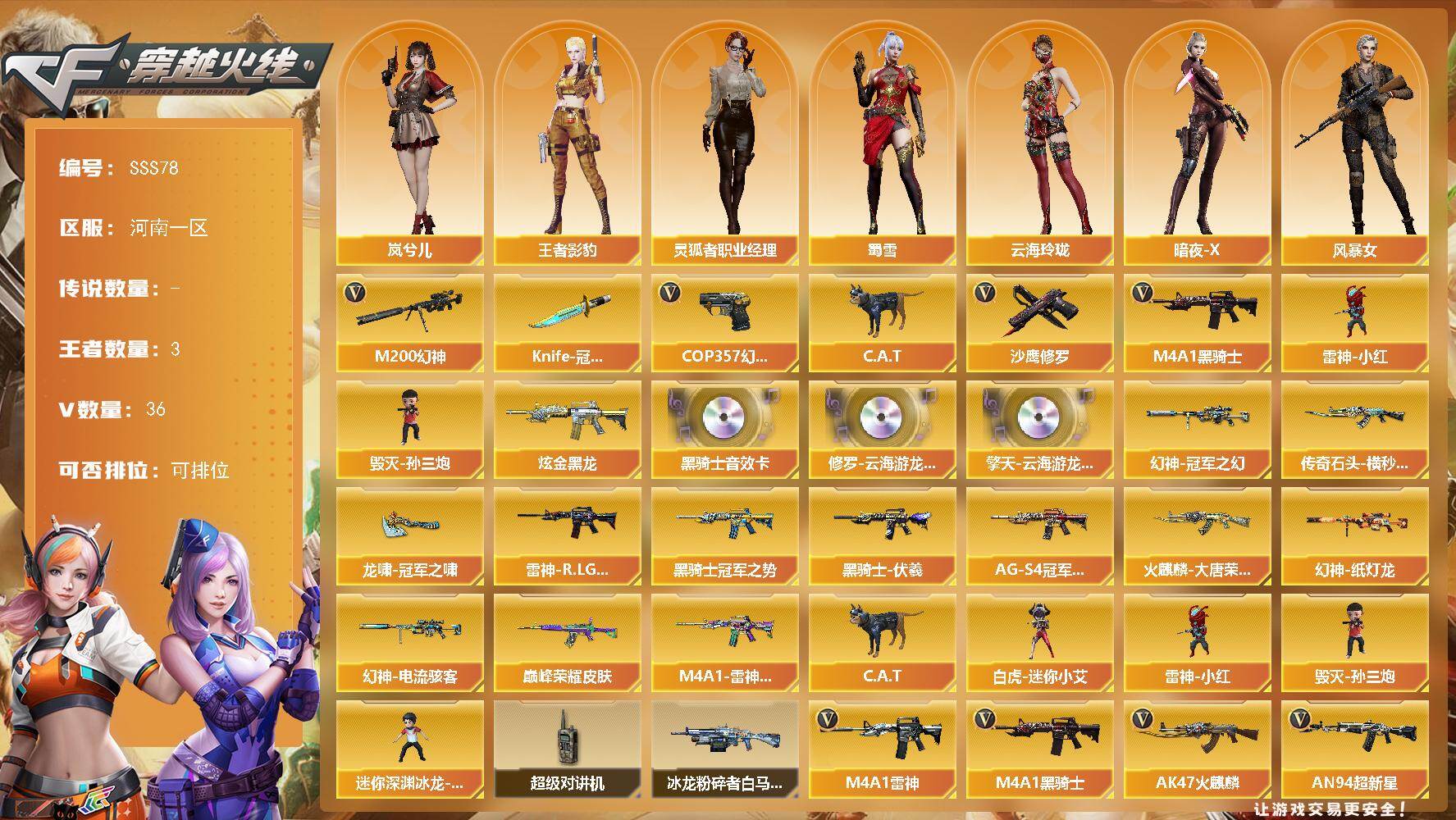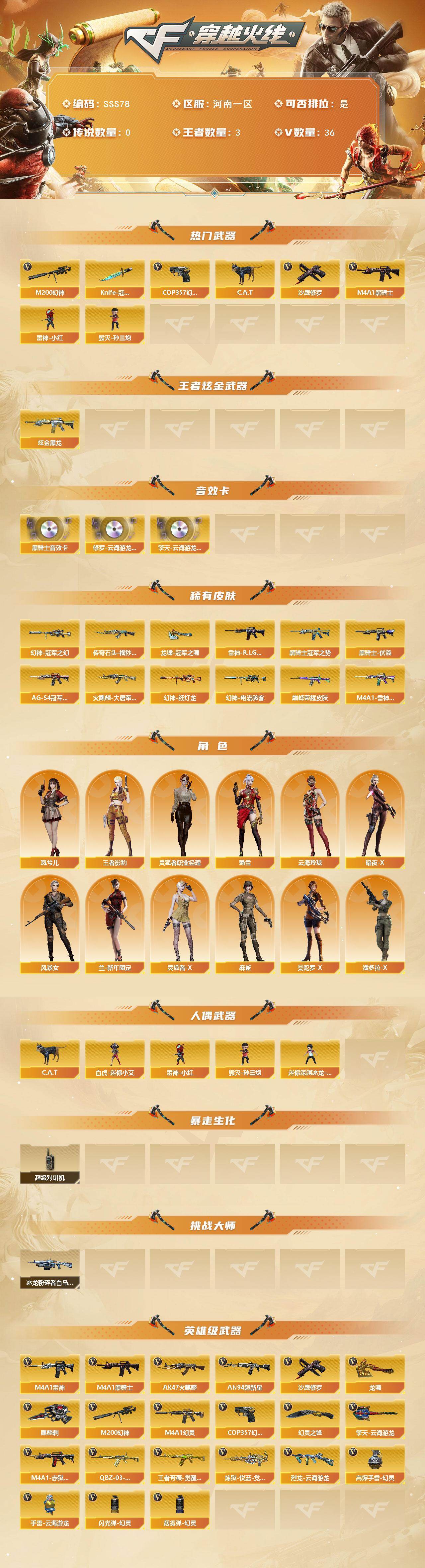 [17369173]河南一区-40V-3王者武器数-1炫金武器数 【热门武器】:M200-幻神,C.A.T,M4A1-黑骑士,雷神-小红,毁灭-孙三炮,COP 357-幻灵,沙鹰-修罗*2,Knife-冠军之刃*2 【王者炫金武器】:炫金黑龙 【音效卡】:修罗-云海游龙音效卡,擎天-云海游龙音效卡,M4A1-黑骑士音效卡 【皮肤】:幻神-冠军之幻,幻神-纸灯龙皮肤,幻神-电流骇客 皮肤,QBZ03-巅峰荣耀皮肤,雷神-R.LGD-CFPLS18冠军*2,M4A1-雷神-巅峰荣耀皮肤,传奇石头-横秒之巅,火麒麟-大唐荣光,黑骑士-冠军之势,黑骑士-伏羲,黑骑士-AG-S4冠军典藏,龙啸-冠军之啸 【角色】:岚兮儿,王者影豹,云海玲珑,暗夜-X,风暴女,兰-新年限定,灵狐者-X,灵狐者-职业经理,麻雀,曼陀罗-X,潘多拉-X,蜀雪 【人偶武器】:雷神-小红,毁灭-孙三炮,白虎-迷你小艾,C.A.T,迷你深渊冰龙-王绿豆 【暴走生化】:超级对讲机 【挑战大师】:冰龙粉碎者-白马银枪 【英雄级武器】:AK47-火麒麟,M4A1-雷神,M4A1-黑骑士,AN94-超新星,M4A1-幻灵,QBZ-03-王者蔷薇-觉醒版,王者芳薇-觉醒版,机械迷城-穹宇,M200-幻神,炼狱-悦蓝-觉醒版,烈龙-云海游龙,沙鹰-修罗*2,COP 357-幻灵,龙啸,麒麟刺,幻灵之锋*2,擎天-云海游龙,高爆手雷-幻灵*6,手雷-云海游龙,闪光弹-幻灵*6,烟雾弹-幻灵*6,M4A1-赤狱骑士 【道具】:BS战队炫彩背包,云海游龙炫彩背包,亚洲杯纪念炫彩背包,全能枪王背包,炫彩背包,女皇终结者-魔龙之吻,救世主-黑桃战神,黄金生化钩,绿色巨人,灵魂忍者,迷雾幽灵,夺命之镰,防化服*3,金色流光-枪王排位*2,星辰流光-枪王排位,枪王排位28赛季金色流光,枪王排位29赛季金色流光,热带奇洋表情,云海游龙表情,C4-沙漠,防弹头盔*3,防弹衣*3,C4工具钳*3,手雷包*3 【特殊枪械】:1黑骑士