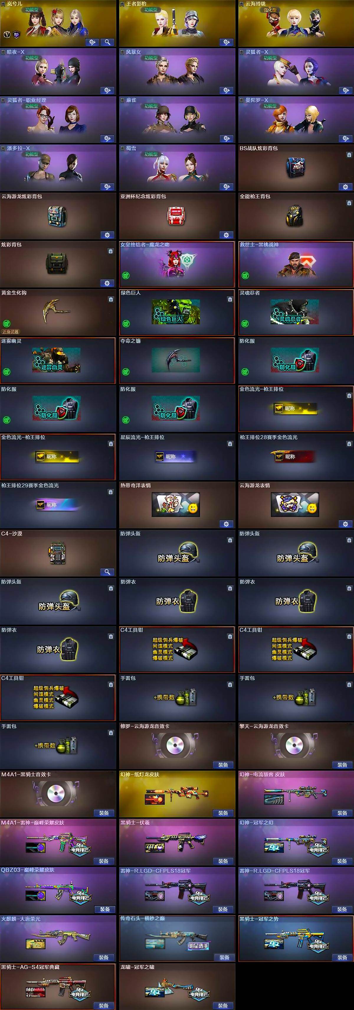 【道具】:BS战队炫彩背包,云海游龙炫彩背包,亚洲杯纪念炫彩背包,全能枪王背包,炫彩背包,女皇终结者-魔龙之吻,救世主-黑桃战神,黄金生化钩,绿色巨人,灵魂忍者,迷雾幽灵,夺命之镰,防化服*3,金色流光-枪王排位*2,星辰流光-枪王排位,枪王排位28赛季金色流光,枪王排位29赛季金色流光,热带奇洋表情,云海游龙表情,C4-沙漠,防弹头盔*3,防弹衣*3,C4工具钳*3,手雷包*3