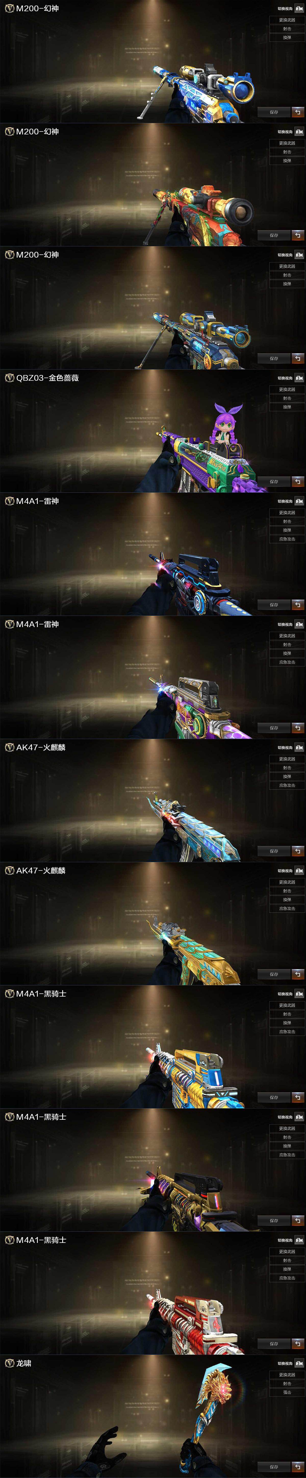 【英雄级武器】:AK47-火麒麟,M4A1-雷神,M4A1-黑骑士,AN94-超新星,M4A1-幻灵,QBZ-03-王者蔷薇-觉醒版,王者芳薇-觉醒版,机械迷城-穹宇,M200-幻神,炼狱-悦蓝-觉醒版,烈龙-云海游龙,沙鹰-修罗*2,COP 357-幻灵,龙啸,麒麟刺,幻灵之锋*2,擎天-云海游龙,高爆手雷-幻灵*6,手雷-云海游龙,闪光弹-幻灵*6,烟雾弹-幻灵*6,M4A1-赤狱骑士