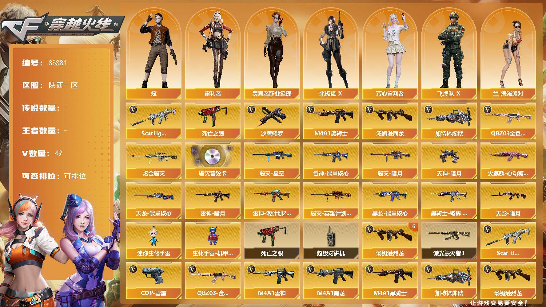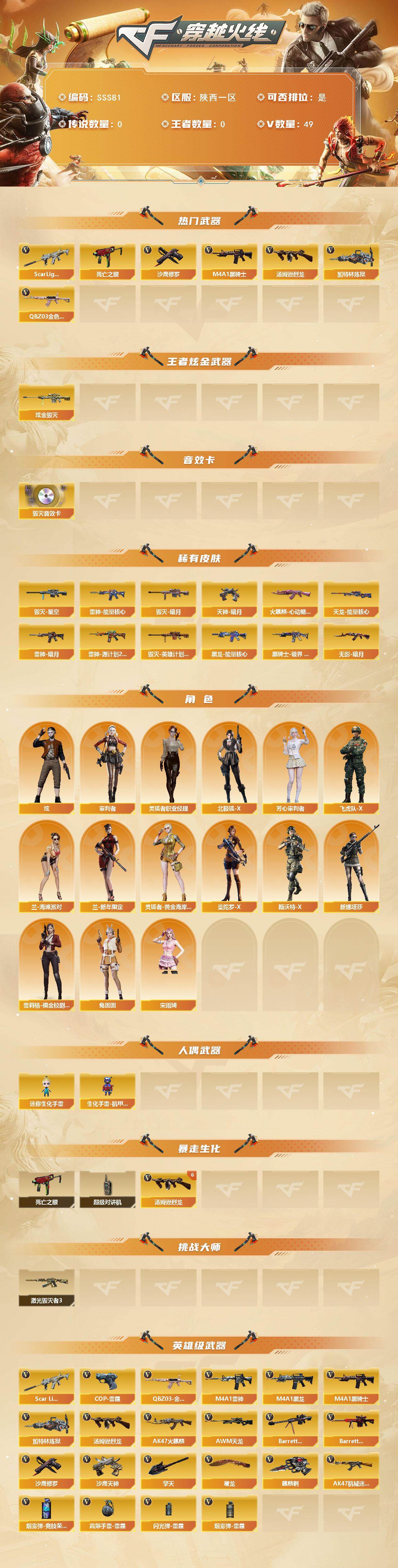 [17369545]陕西一区-51V-0王者武器数-1炫金武器数 【热门武器】:QBZ03-金色蔷薇,Scar Light-白虎,死亡之眼,M4A1-黑骑士*2,汤姆逊-烈龙*6,加特林-炼狱,沙鹰-修罗*3 【王者炫金武器】:炫金毁灭 【音效卡】:Barrett-毁灭音效卡 【皮肤】:雷神-暗月,雷神-能量核心,雷神-源计划2.0专属 皮肤,火麒麟-心动糖果,毁灭-暗月,毁灭-星空,毁灭-英雄计划 皮肤,黑龙-能量核心,黑骑士-破界 皮肤,无影-暗月,天龙-能量核心,天神-暗月*2 【角色】:炫,审判者,宋雨琦,北极狐-X,芳心审判者,飞虎队-X,兰-海滩派对,兰-新年限定,灵狐者-黄金海岸,灵狐者-职业经理,曼陀罗-X,斯沃特-X,兔囡囡,新娜塔莎,雪莉杨-摸金校尉 【人偶武器】:迷你生化手雷,生化手雷-机甲核心*3 【暴走生化】:死亡之眼,超级对讲机 【挑战大师】:激光毁灭者III 【英雄级武器】:AK47-火麒麟*2,M4A1-黑龙,M4A1-雷神,M4A1-黑骑士*2,AK47-机械迷城,Scar Light-白虎,QBZ03-金色蔷薇,AWM-天龙,Barrett-毁灭,Barrett-极光,加特林-炼狱,汤姆逊-烈龙*6,沙鹰-修罗*3,沙鹰-天神,COP-雷霆,屠龙*2,擎天,麒麟刺,高爆手雷-雷霆*5,闪光弹-雷霆*5,烟雾弹-雷霆*5,烟雾弹-竞技荣光 【道具】:CFS限定背包,QQ会员专属背包,战舰背包,炫彩背包,超级背包,绿色巨人,灵魂忍者*2,变异宝贝,妖姬,迷雾幽灵*2,生化弹匣,夺命之镰,防化服*2,枪王排位28赛季金色流光,枪王排位29赛季金色流光,防弹头盔*3,防弹衣*3,C4工具钳*2,手雷包*2 【特殊枪械】:1白虎,2黑骑士,6烈龙,1炼狱