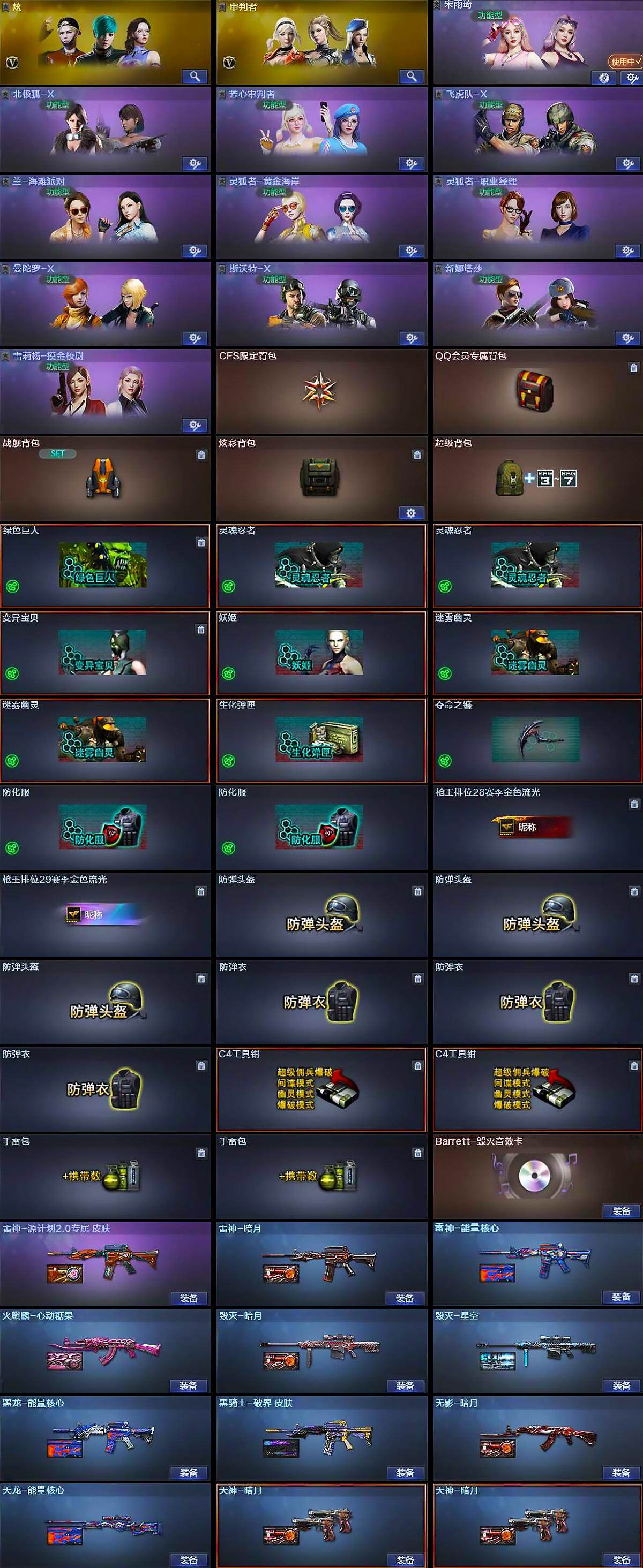 【道具】:CFS限定背包,QQ会员专属背包,战舰背包,炫彩背包,超级背包,绿色巨人,灵魂忍者*2,变异宝贝,妖姬,迷雾幽灵*2,生化弹匣,夺命之镰,防化服*2,枪王排位28赛季金色流光,枪王排位29赛季金色流光,防弹头盔*3,防弹衣*3,C4工具钳*2,手雷包*2