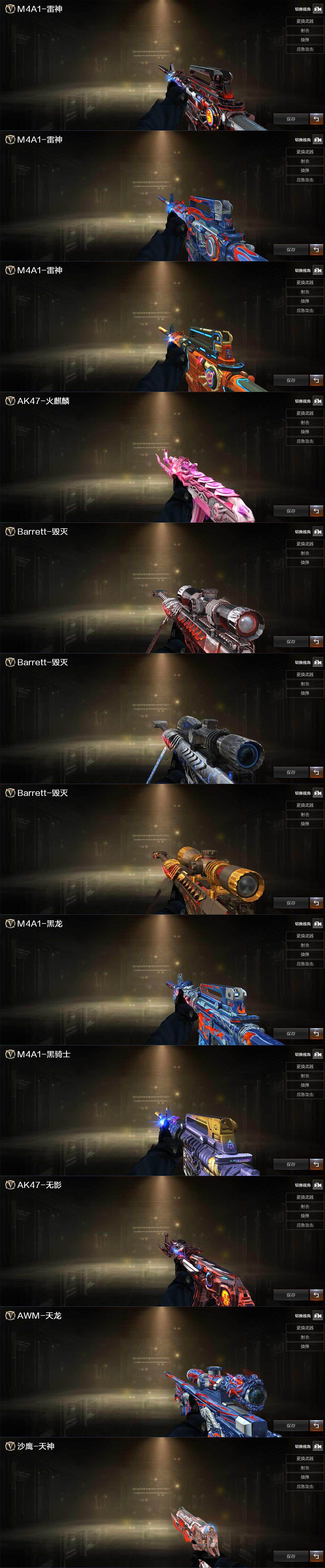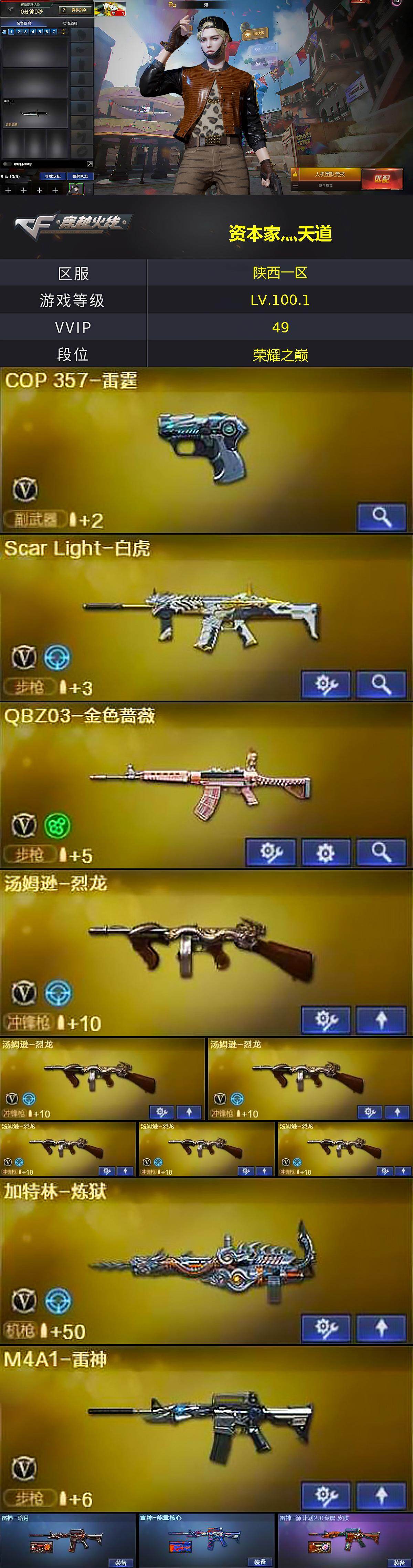 【热门武器】:QBZ03-金色蔷薇,Scar Light-白虎,死亡之眼,M4A1-黑骑士*2,汤姆逊-烈龙*6,加特林-炼狱,沙鹰-修罗*3