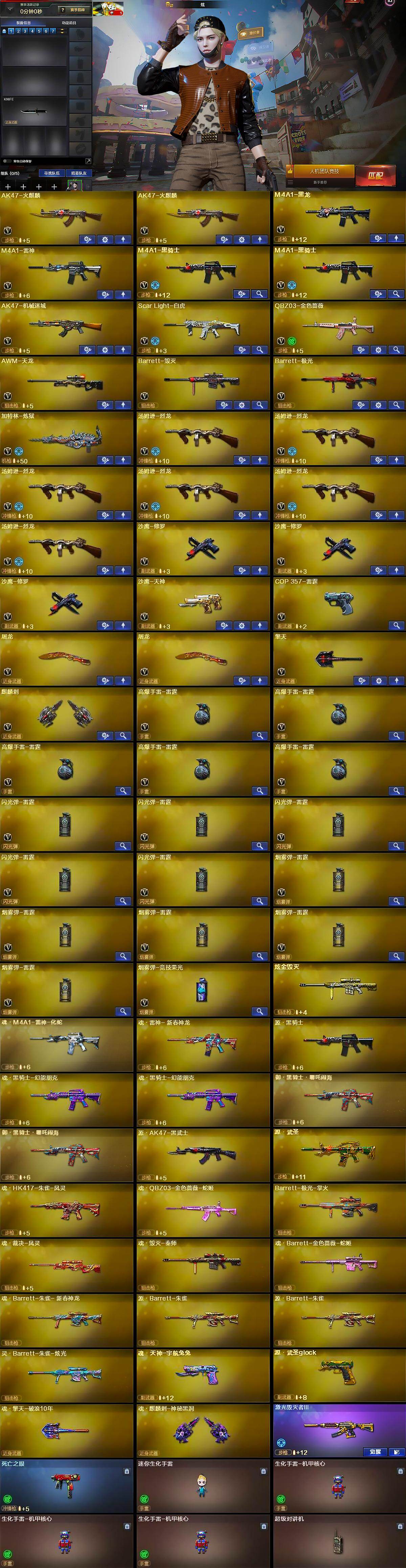 - [16165611]河南一区-6V-0王者-0炫金 【传说角色】:传说星骇 【音效卡】:AWM-裁决音效卡 【角色】:风暴女,蛇姬,雪莉杨-摸金校尉 【挑战大师】:冰龙粉碎者-白马银枪 【英雄级武器】:AK47-火麒麟,黑骑士-海王,AWM-裁决,AA-12-雷霆 【道具】:BS战队炫彩背包,云山科技背包,超级背包,女皇终结者-魔龙之吻,救世主-黑桃战神,绿色巨人,灵魂忍者,迷雾幽灵,夺命之镰,防化服*3,流光-再燃火线,防弹头盔*3,防弹衣*3,C4工具钳*3,手雷包*3 【特殊枪械】: