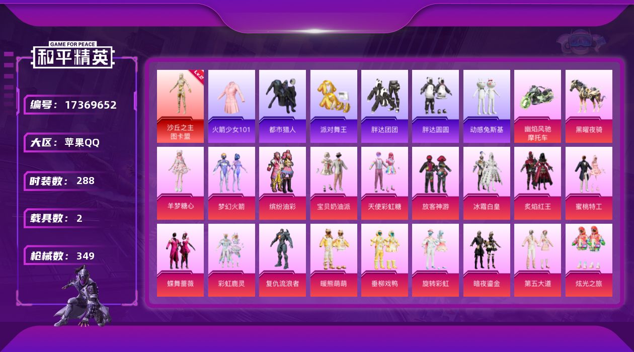 [17369652]【1224】苹果 手Q-1神装-26粉装-13特效枪-2载具-14粉色飞行器-127606热力值-19王牌印记-288套装-349枪皮