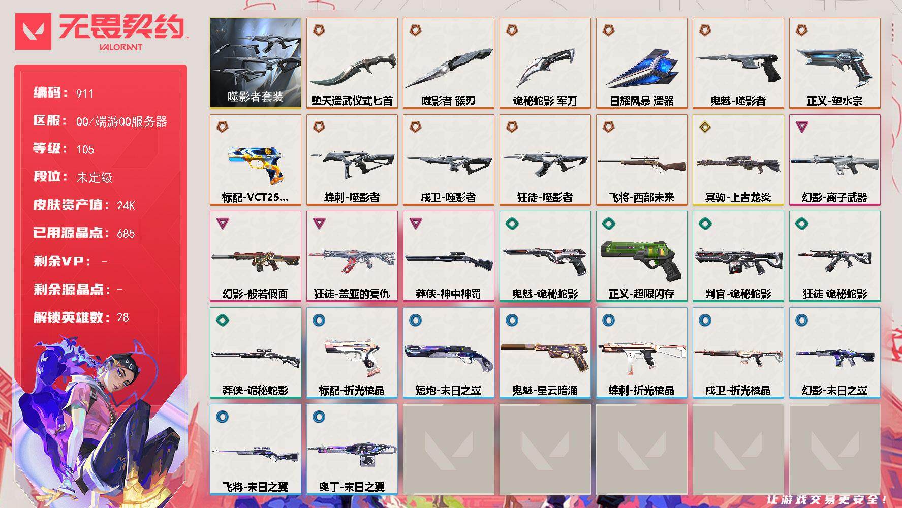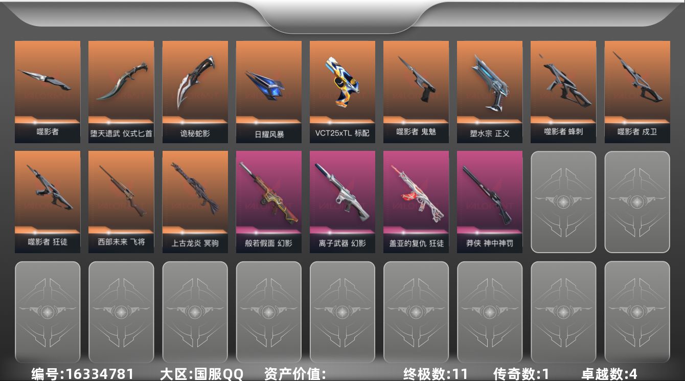 [16334781]【套装】:噬影者套装 【英雄】:幻棱,炼狱,维斯,暮蝶,钛狐,壹决,铁臂,捷风,雷兹,幽影,不死鸟,贤者,猎枭,蝰蛇,零,芮娜,奇乐,尚勃勒,霓虹,斯凯,夜露,星礈,K/O,海神,盖可,黑梦,钢锁 【近战武器】:近战武器-噬影者 簇刃,近战武器-堕天遗武 仪式匕首,近战武器-诡秘蛇影 军刀,近战武器-日耀风暴 遗器 【狂徒】:狂徒-噬影者,狂徒-盖亚的复仇,狂徒-诡秘蛇影 【幻影】:幻影-般若假面,幻影-离子武器,幻影-末日之翼 【戍卫】:戍卫-噬影者,戍卫-折光棱晶 【冥驹】:冥驹-上古龙炎 【飞将】:飞将-西部未来,飞将-末日之翼 【莽侠】:莽侠-神中神罚,莽侠-诡秘蛇影 【奥丁】:奥丁-末日之翼 【判官】:判官-诡秘蛇影 【蜂刺】:蜂刺-噬影者,蜂刺-折光棱晶 【标配】:标配-折光棱晶 【VCT手枪】:标配-VCT25 x TL 【正义】:正义-塑水宗,正义-超限闪存 【鬼魅】:鬼魅-噬影者,鬼魅-诡秘蛇影,鬼魅-星云暗涌 【短炮】:短炮-末日之翼 【卡面】:《双城之战》拥抱 卡面,精灵大战 卡面,欢迎来到底城 卡面,南瓜盛典 卡面,修车达人 卡面,正义的化身 卡面,战术熊与伙伴们 卡面,零点嗅探设计图 卡面,无畏契约GO!第一卷:芮娜 卡面,清除名单 卡面,无畏契约GO!第一卷:零 卡面,战术小伙伴 卡面,代号红色 卡面,新兵报到 卡面,V契约 卡面,无畏契约 卡面 【喷漆】:嗨宝南瓜灯 喷漆,嘭! 喷漆,都算到了 喷漆,控场勿近 喷漆,小丑猫 喷漆,熊抱 喷漆,新潮流 喷漆,买装还是存钱 喷漆,无畏契约GO!第一卷:芮娜 喷漆,胜利属于无畏契约 喷漆,GLHF 喷漆,无畏契约 喷漆 【挂饰】:伞绳 挂饰,《双城之战》小蛋糕 挂饰,第九季//第三幕 纪念币 挂饰,工具腰带 挂饰,无畏契约GO!第一卷 芮娜 挂饰,无畏契约GO!第一卷 零 挂饰,熔岩灯 挂饰,第九季//第二幕 纪念币 挂饰,第八季//第三幕 纪念币 挂饰,天外飞客 挂饰,《双城之战》魄罗 挂饰,无畏契约 纪念币 挂饰