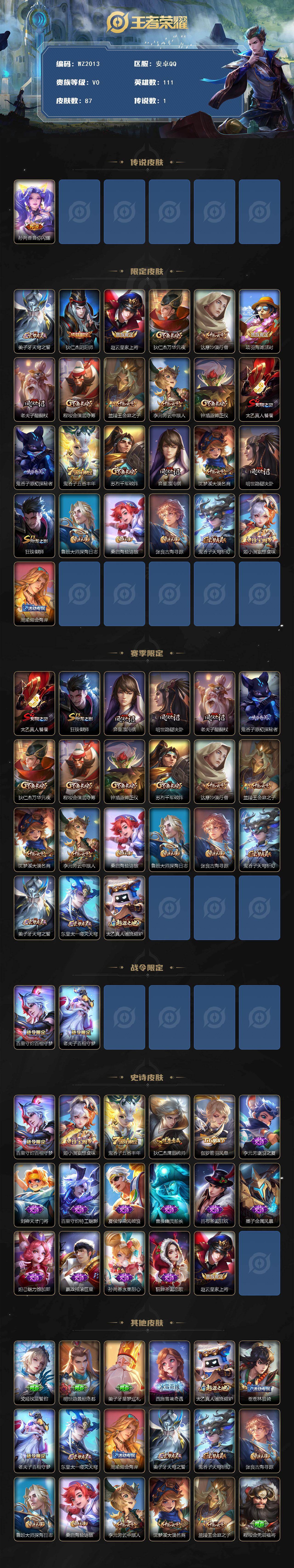 [17373155]安卓Q-V0-荣耀黄金III段位-111英雄-87皮肤-1传说-17史诗 【传说皮肤】:孙尚香音你闪耀 【限定皮肤】:姜子牙天穹之誓,狄仁杰阴阳师,赵云皇家上将,狄仁杰万华元夜,达摩沙漠行僧,项羽海滩派对,老夫子醍醐杖,程咬金演武夺筹,兰陵王金庭之子,李元芳云中旅人,钟馗驱傩正仪,太乙真人饕餮,鬼谷子原初探秘者,鬼谷子五谷丰年,苏烈千军破阵,弈星混沌棋,沈梦溪大漠名商,明世隐疑决卦,狂铁御狮,鲁班大师探海日志,桑启海盐诗旅,张良古海寻踪,鬼谷子天穹祈灯,姬小满妄想食味,周瑜熔金海岸 【赛季限定】:太乙真人饕餮,狂铁御狮,弈星混沌棋,明世隐疑决卦,老夫子醍醐杖,鬼谷子原初探秘者,狄仁杰万华元夜,程咬金演武夺筹,钟馗驱傩正仪,苏烈千军破阵,达摩沙漠行僧,兰陵王金庭之子,沈梦溪大漠名商,李元芳云中旅人,桑启海盐诗旅,鲁班大师探海日志,张良古海寻踪,鬼谷子天穹祈灯,姜子牙天穹之誓,东皇太一噬灭天穹,太乙真人谧流熔炉 【战令限定】:百里守约百相守梦,老夫子百相守梦 【史诗皮肤】:百里守约百相守梦,姬小满妄想食味,鬼谷子五谷丰年,狄仁杰鹰眼统帅,伽罗箭羽风息,李元芳逐浪之夏,刘禅天才门将,百里守约特工魅影,夏侯惇乘风破浪,曹操幽灵船长,吕布圣诞狂欢,墨子金属风暴,妲己魅力维加斯,嬴政摇滚巨星,孙尚香水果甜心,貂蝉圣诞恋歌,赵云皇家上将 【其他皮肤】:戈娅玫蓝誓约,明世隐景韶洛都,姜子牙星梦巡礼,西施雪境奇遇,太乙真人谧流熔炉,苍苍林狼骑,老夫子百相守梦,东皇太一噬灭天穹,周瑜熔金海岸,姜子牙天穹之誓,鬼谷子天穹祈灯,张良古海寻踪,鲁班大师探海日志,桑启海盐诗旅,李元芳云中旅人,沈梦溪大漠名商,兰陵王金庭之子,程咬金无双福将,达摩沙漠行僧,苏烈千军破阵,鲁班大师乓乓大师,钟馗驱傩正仪,程咬金演武夺筹,狄仁杰万华元夜,鬼谷子原初探秘者,狂铁特工战影,老夫子醍醐杖,明世隐疑决卦,弈星混沌棋,沈梦溪鲨炮海盗猫,吕布野性能量,明世隐虹云星官,狂铁御狮,孙尚香沉稳之力,太乙真人饕餮,关羽龙腾万里,狄仁杰阴阳师,甄姬花好人间,花木兰兔女郎,亚瑟死亡骑士,妲己少女阿狸,孙膑天使之翼,宫本武藏未来纪元,扁鹊化身博士,武则天东方不败,程咬金爱与正义,芈月红桃皇后,赵云白执事,韩信街头霸王,韩信教廷特使,项羽海滩派对,司空震启蛰,阿古朵熊喵少女,盘古创世神祝,李信灼热之刃,伽罗花见巫女,盾山极冰防