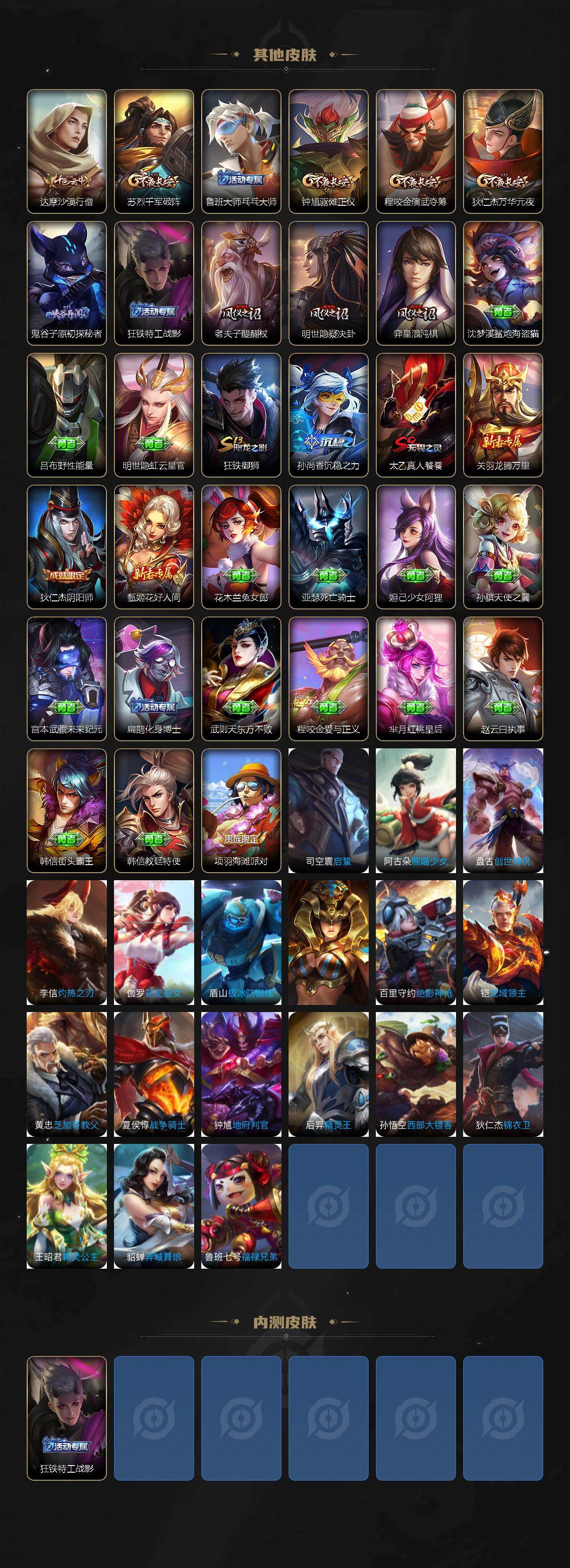 【限定皮肤】:姜子牙天穹之誓,狄仁杰阴阳师,赵云皇家上将,狄仁杰万华元夜,达摩沙漠行僧,项羽海滩派对,老夫子醍醐杖,程咬金演武夺筹,兰陵王金庭之子,李元芳云中旅人,钟馗驱傩正仪,太乙真人饕餮,鬼谷子原初探秘者,鬼谷子五谷丰年,苏烈千军破阵,弈星混沌棋,沈梦溪大漠名商,明世隐疑决卦,狂铁御狮,鲁班大师探海日志,桑启海盐诗旅,张良古海寻踪,鬼谷子天穹祈灯,姬小满妄想食味,周瑜熔金海岸