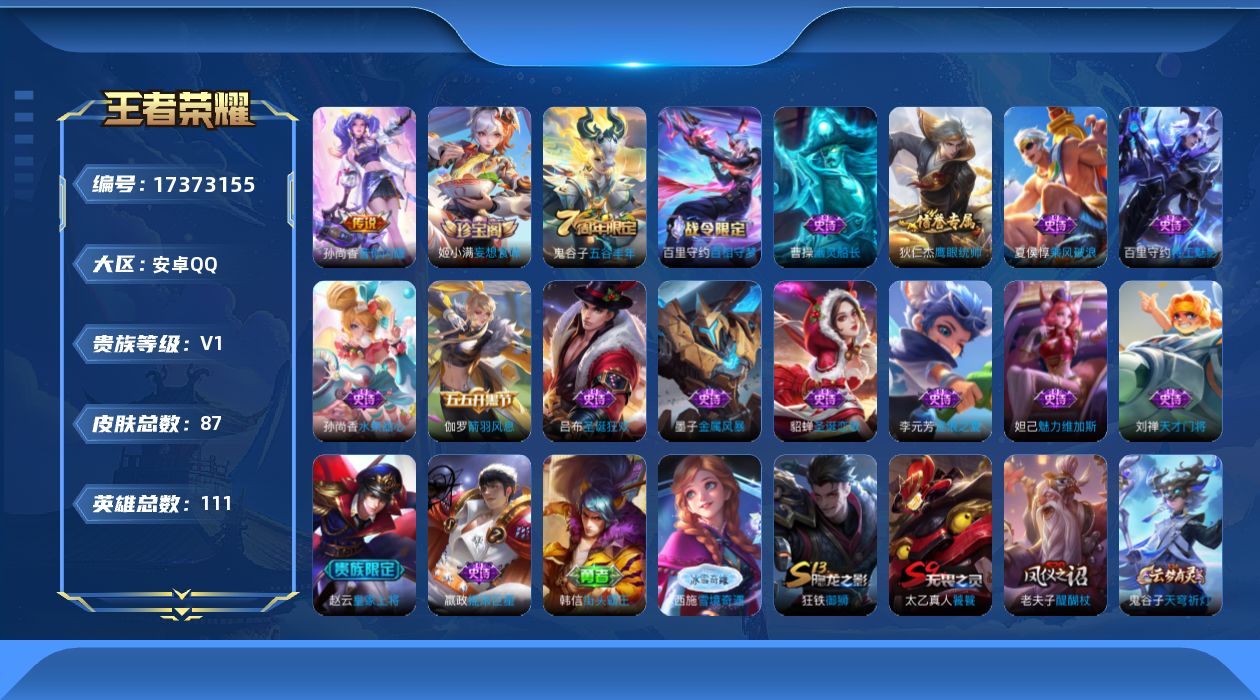 [17373155]安卓Q-V0-荣耀黄金III段位-111英雄-87皮肤-1传说-17史诗