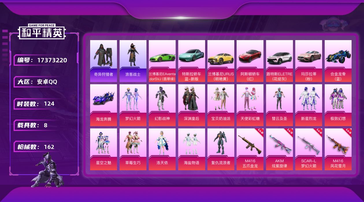 [17373220]【1206】安卓 手Q-13粉装-10特效枪-8载具-5粉色飞行器-71911热力值-3王牌印记-124套装-162枪皮