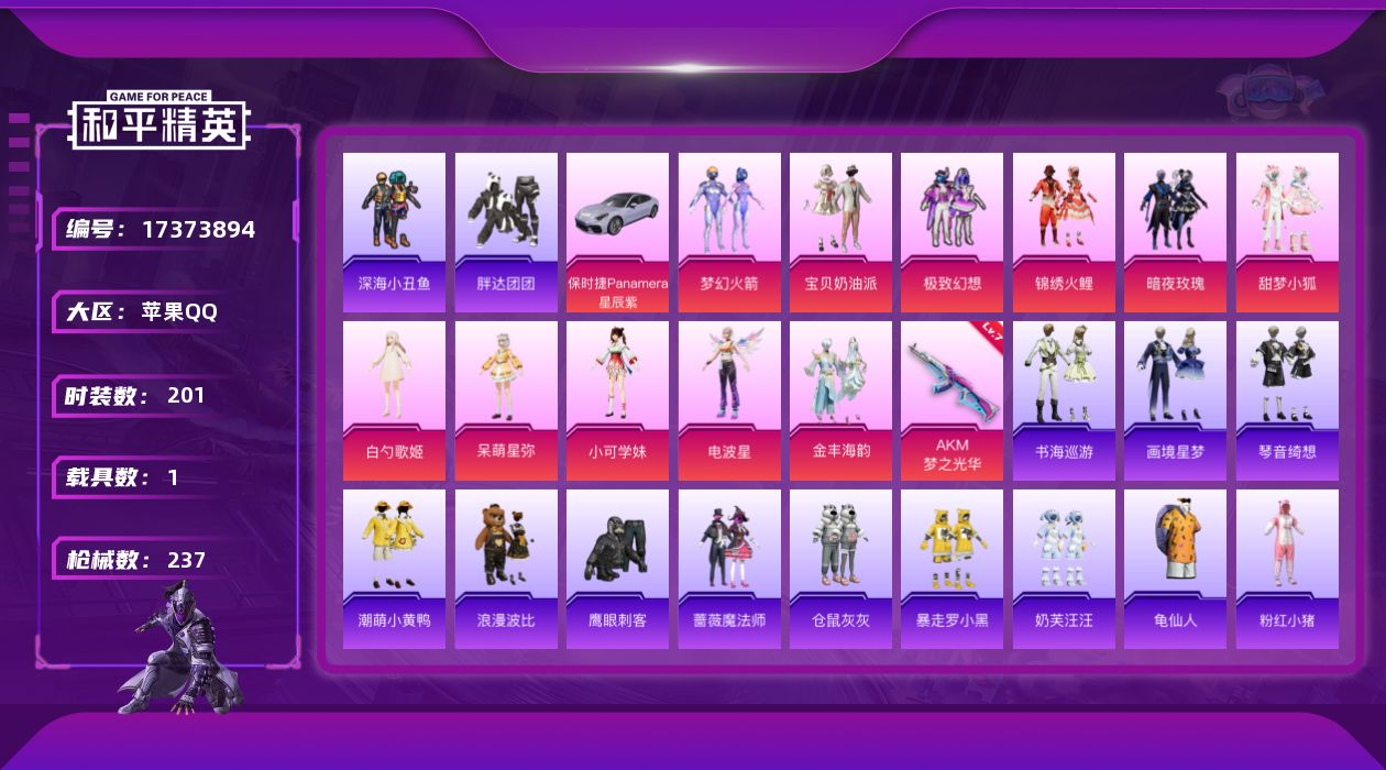 [17373894]【店主推荐捡漏号!可直接换绑】苹果 手Q-12粉装-3特效枪-1载具-6粉色飞行器-80193热力值-7王牌印记-201套装-237枪皮【热门品类】:粉装-梦幻火箭,套装-深海小丑鱼,套装-胖达团团,旭日初心兜帽大衣,套装-龟仙人,套装-潮萌小黄鸭,套装-浪漫波比,套装-粉红小猪【粉色套装】:粉装-宝贝奶油派,粉装-梦幻火箭,粉装-极致幻想,粉装-锦绣火鲤,粉装-暗夜玫瑰,粉装-甜梦小狐,角色-白勺歌姬,角色-呆萌星弥,角色-小可学妹,角色-电波星,粉装-金丰海韵,角色-罪夜之冕【粉色枪皮等级】:AKM-梦之光华(七级),AKS-74U-森灵之息(五级),燃烧瓶-薄荷可可(六级)【粉色载具】:保时捷Panamera(星辰紫)【粉色枪皮】:AKM-梦之光华,AKS-74U-森灵之息,燃烧瓶-薄荷可可【粉色飞行器】:梦幻火箭飞行器,锦绣火鲤飞行器,梦之光华飞行器,庄周梦蝶飞行器,绝色倾城飞行器,电糖天使飞行器