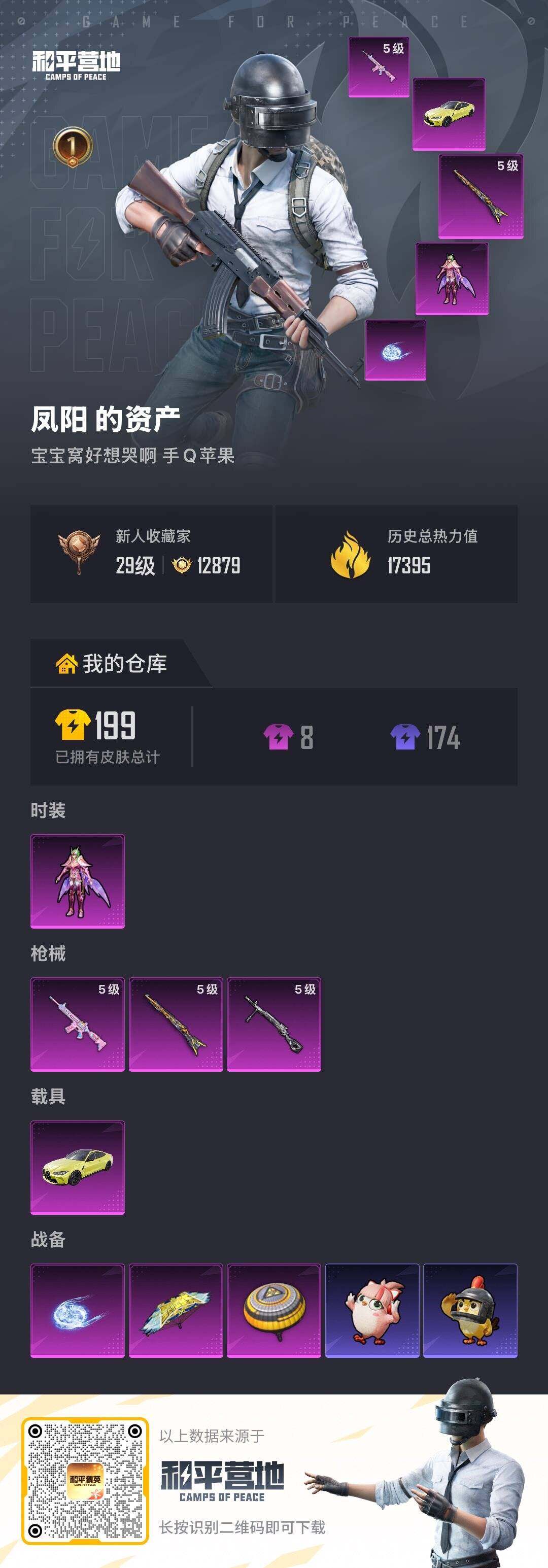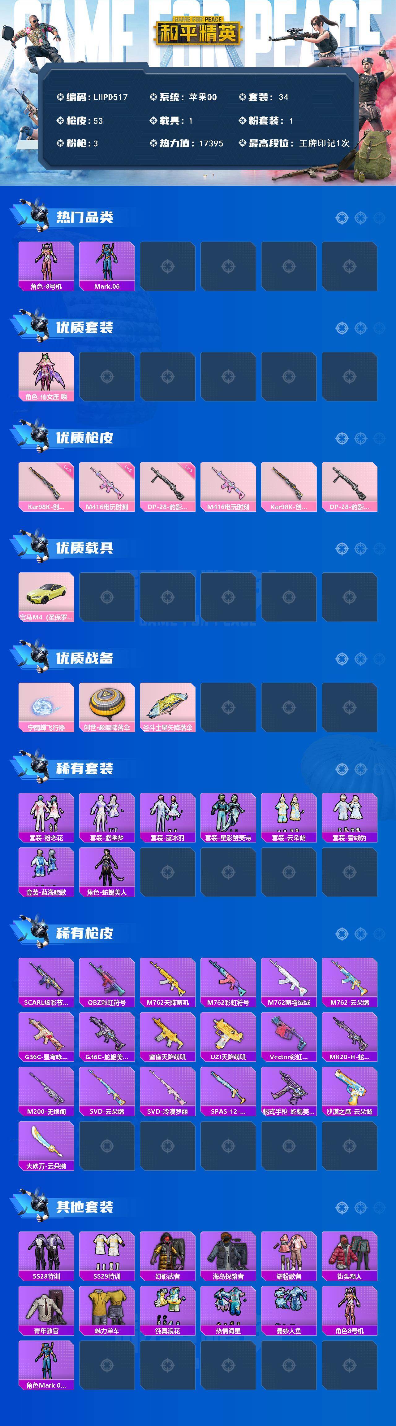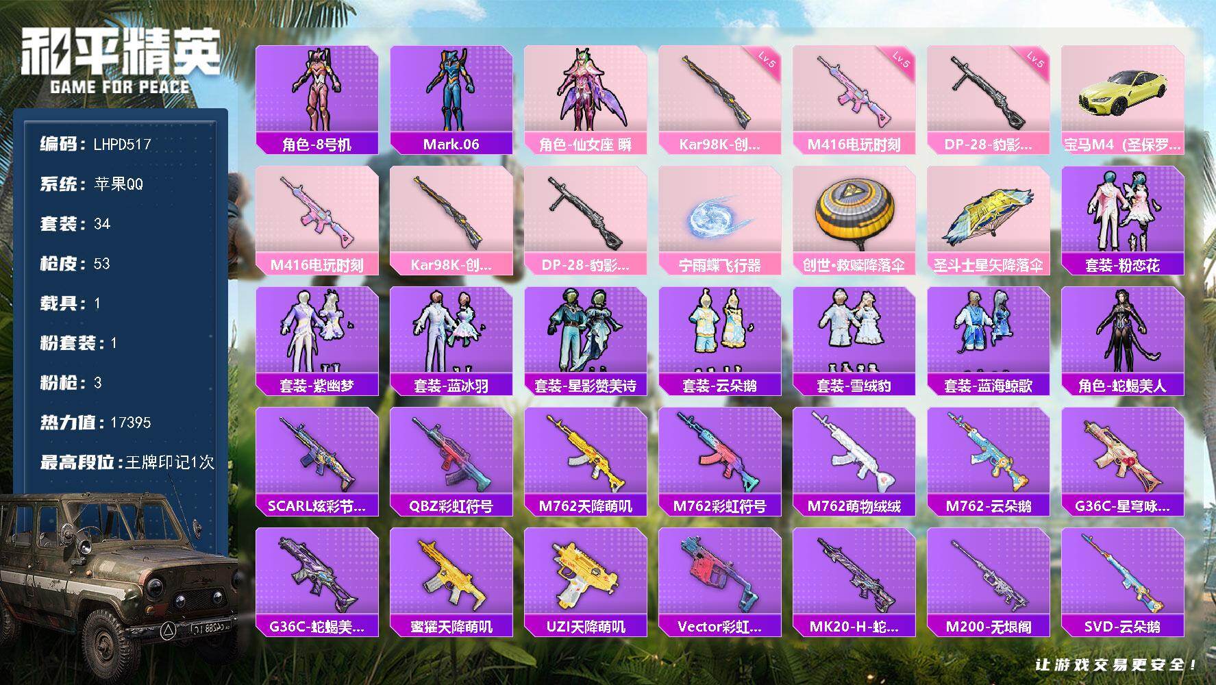 [17373899]【店主推荐捡漏号!可直接换绑】苹果 手Q-1粉装-3特效枪-1载具-1粉色飞行器-17395热力值-1王牌印记-34套装-53枪皮【热门品类】:角色-8号机,角色-Mark.06【粉色套装】:角色-仙女座 瞬【粉色枪皮等级】:M416-电玩时刻(五级),Kar98K-创世·救赎(五级),DP-28-豹影疾电(五级)【粉色载具】:宝马M4(圣保罗黄)【粉色枪皮】:M416-电玩时刻,Kar98K-创世·救赎,DP-28-豹影疾电【粉色飞行器】:宁雨蝶飞行器
