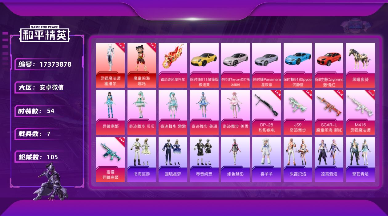 [17373878]【特价出售/店主推荐】安卓 微信-2神装-6粉装-9特效枪-7载具-4粉色飞行器-40415热力值-3王牌印记-54套装-105枪皮 【红色神装等级】:魔童闹海-哪吒(一级),灵猫魔法师-塞维尔(三级) 【红色角色神装】:魔童闹海-哪吒,灵猫魔法师-塞维尔 【粉色套装】:角色-奇迹舞步 贝贝,角色-奇迹舞步 雅雅,角色-奇迹舞步 美琪,角色-奇迹舞步 美雪,角色-异瞳寒姬,角色-辉云木星 【粉色枪皮等级】:SCAR-L-魔童闹海 哪吒(三级),M416-灵猫魔法师(三级),蜜獾-异瞳寒姬(一级),AKS-74U-森灵之息(五级),JS9-奇迹舞步(五级),Mk14-福马献瑞(五级),DP-28-豹影疾电(五级),PKM-萌骑夺宝(一级),信号枪-金乌曜日(三级) 【粉色载具】:保时捷911 敞篷版(极速黄),保时捷Taycan 旅行版(冰莓粉),保时捷Panamera(星辰紫),保时捷918 Spyder(沉静蓝),保时捷Cayenne(激情红),踏焰逐风摩托车,黑曜夜骑 【粉色枪皮】:SCAR-L-魔童闹海 哪吒,M416-灵猫魔法师,蜜獾-异瞳寒姬,AKS-74U-森灵之息,JS9-奇迹舞步,Mk14-福马献瑞,DP-28-豹影疾电,PKM-萌骑夺宝,信号枪-金乌曜日 【粉色飞行器】:炫彩糖果飞行器,灵猫魔法师飞行器,飞天猪飞行器,灵珠游龙飞行器 【粉色降落伞】:洛神天依降落伞,灵猫魔法师降落伞,奇迹舞步降落伞,喜羊羊与灰太狼降落伞,魔童闹海 哪吒降落伞,异瞳寒姬降落伞,炫彩糖果降落伞,虹云熊熊降落伞,虎痴许褚降落伞 【稀有套装】:套装-雪国风尚,套装-炫彩糖果,套装-马上有钱,角色-摩登魅猫,套装-云朵鹅,套装-雪绒豹,角色-夜瞳黯灵,套装-朱霞炽焰,套装-凌霄紫焰,套装-擎苍青焰,玩偶服-喜羊羊,角色-绯色魅影,套装-书海巡游,套装-画境星梦,套装-琴音绮想,角色-碧青流霞,套装-雨过天青,套装-红釉青花,角色-孙斩天 【稀有枪皮】:AUG-冰晶雪宝,AKM-灵猫魔法师,M16A4-幻世战舞者,SCAR-L-炫彩节奏,GROZA-荧海星豚,QBZ-洛神天依,M762-云朵鹅,Mk47-洛神天依,蜜獾-虎痴许褚,ACE32-画境星梦,ARX-凌霄紫焰,UZI-天降萌叽,UZI-炫彩节奏,UMP45-夜灯,汤姆逊-天降萌叽,汤姆逊-灵猫魔法师,汤姆逊-像素花束
