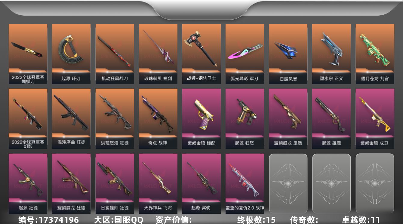 [17374196]【149】【套装】:2022全球冠军赛套装,起源套装,耀鳞威龙套装 【英雄】:幻棱,炼狱,维斯,暮蝶,钛狐,壹决,铁臂,捷风,雷兹,幽影,不死鸟,贤者,猎枭,蝰蛇,零,芮娜,奇乐,尚勃勒,霓虹,斯凯,夜露,星礈,K/O,海神,盖可,黑梦,钢锁 【近战武器】:近战武器-2022全球冠军赛 蝴蝶刀,近战武器-黑波之刃,近战武器-威龙之刃,近战武器-珍珠棘贝 短剑,近战武器-钢轨卫士 战锤,近战武器-弧光异彩 军刀,近战武器-机动狂飙 战刀,近战武器-起源 环刃,近战武器-日耀风暴 遗器 【狂徒】:狂徒-洪荒怒焰,狂徒-混沌序曲,狂徒-起源,狂徒-日冕雄师,狂徒-耀鳞威龙,狂徒-钢轨卫士,狂徒-弧光异彩 【幻影】:幻影-2022全球冠军赛,幻影-噬源兽防卫工程,幻影-珍珠棘贝,幻影-战术小伙伴 【戍卫】:戍卫-紫阙金琅,戍卫-钢轨卫士,戍卫-珍珠棘贝,戍卫-彩梦之城,戍卫-萌彩剪影 【獠犬】:獠犬-弧光异彩,獠犬-复古浪潮,獠犬-胡桃狂想,獠犬-战术小伙伴 【冥驹】:冥驹-起源,冥驹-复古浪潮,冥驹-胡桃狂想 【飞将】:飞将-天界神兵,飞将-沙尘幻旅,飞将-信手涂鸦,飞将-光导纤维 【莽侠】:莽侠-深海水族 【战神】:战神-奇点,战神-盖亚的复仇//2.0,战神-萌彩剪影,战神-深海水族 【奥丁】:奥丁-巨神铁甲,奥丁-信手涂鸦,奥丁-战术小伙伴 【判官】:判官-偃月苍龙,判官-萌彩剪影 【雄鹿】:雄鹿-起源,雄鹿-彩梦之城,雄鹿-复古浪潮 【骇灵】:骇灵-沙尘幻旅,骇灵-珍珠棘贝,骇灵-光导纤维,骇灵-信手涂鸦 【蜂刺】:蜂刺-弧光异彩,蜂刺-胡桃狂想,蜂刺-深海水族,蜂刺-战术小伙伴 【标配】:标配-紫阙金琅,标配-浪漫雪国,标配-彩梦之城,标配-光导纤维 【正义】:正义-塑水宗,正义-多边形,正义-复古浪潮,正义-纳米打击 【鬼魅】:鬼魅-耀鳞威龙,鬼魅-光导纤维,鬼魅-胡桃狂想,鬼魅-信手涂鸦 【狂怒】:狂怒-起源,狂怒-钢轨卫士,狂怒-珍珠棘贝,狂怒-萌彩剪影 【短炮】:短炮-钢轨卫士,短炮-弧光异彩,短炮-深海水族 【卡面】:终章:激斗汉堡 卡面,进入射程 卡面,《双城之战》拥抱 卡面,精灵大战 卡面,欢迎来到底城 卡面,南瓜盛典 卡面,超限闪存 卡面,梦幻奶茶 卡面,源能反应 卡面,打造专属狂徒 卡面,零点嗅探设计图 卡面,表象之下 卡面,虹吸式咖啡壶 卡