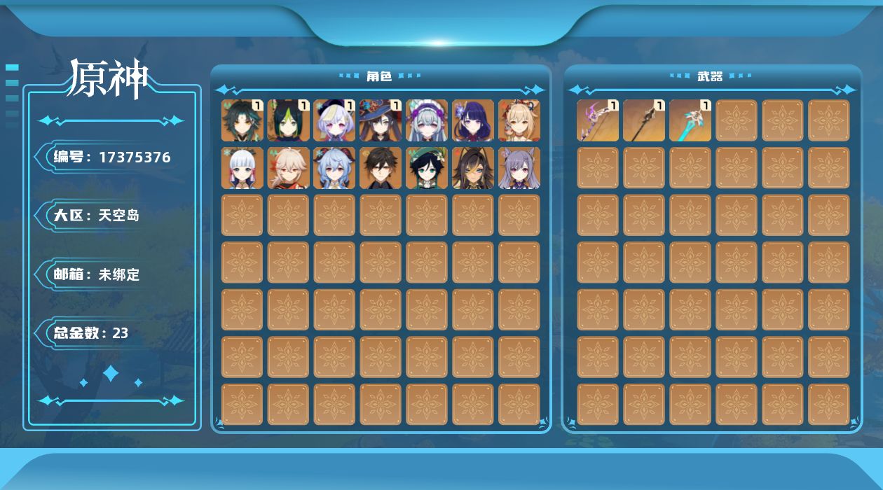 0命迪希雅,1命提纳里,0命雷电将军,0命枫原万叶,0命神里绫华,0命钟离,0命甘雨,1命魈,0命宵宫,0命温迪,0命刻晴,1命七七,1命莫娜,0命梦见月瑞希,0命丝柯克,精1飞雷之弦振,精1贯虹之槊,精1天空之刃