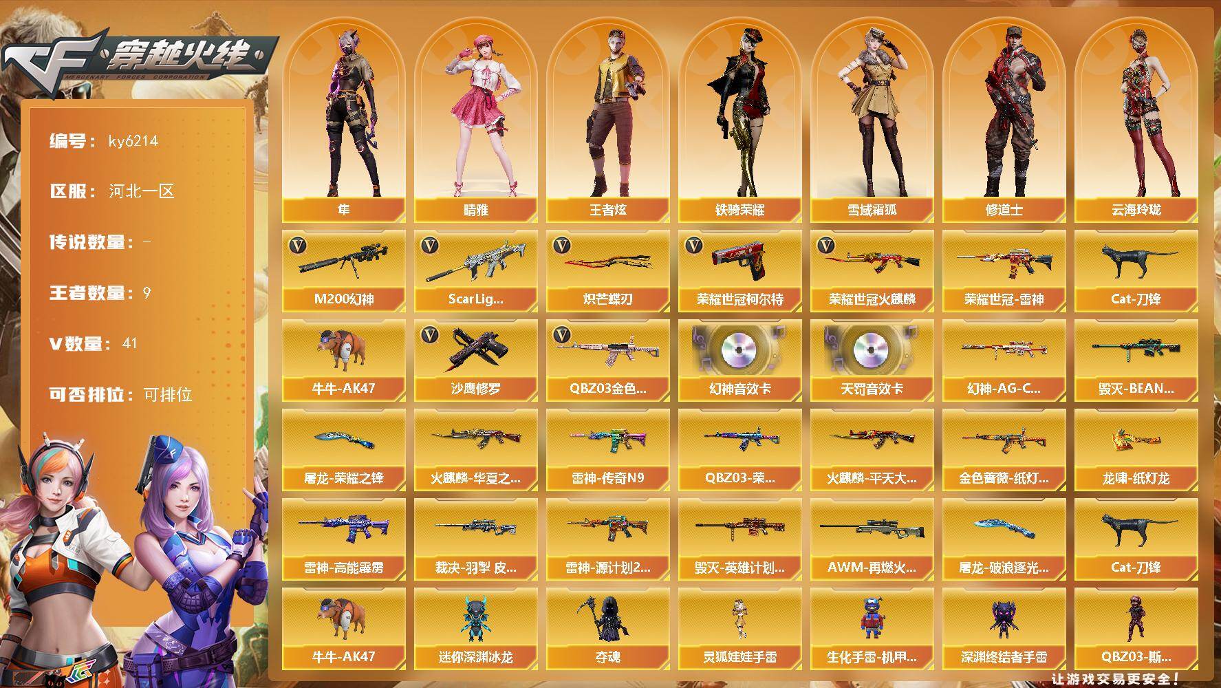 [17377078]河北一区-46V-9王者武器数-0炫金武器数 【传说角色】:传说影煞 【热门武器】:QBZ03-金色蔷薇,Scar Light-白虎,M200-幻神,荣耀世冠-火麒麟,荣耀世冠-雷神,荣耀世冠-柯尔特,Cat-刀锋,牛牛-AK47,沙鹰-修罗*2,炽芒蝶刃 【音效卡】:M200-幻神音效卡,QBZ03-天罚音效卡 【皮肤】:幻神-AG-CFPL S24冠军 皮肤,QBZ03-荣耀世冠白鲨,金色蔷薇-纸灯龙皮肤,裁决-羽掣 皮肤,雷神-传奇N9,雷神-高能霹雳 皮肤,雷神-源计划2.0专属 皮肤,火麒麟-华夏之心,火麒麟-平天大圣*2,毁灭-BEAN-2020MVP,毁灭-英雄计划 皮肤,AWM-再燃火线,屠龙-荣耀之锋,屠龙-破浪逐光 皮肤,龙啸-纸灯龙皮肤 【角色】:晴雅,隼,王者炫,雪域霜狐,奇洋探员,修道士,云海玲珑,初恋灵狐,飞虎队-X,娟娟,灵狐者-X,灵狐者-七夕宝贝,流浪蔷薇,麻雀,曼陀罗-X,潘多拉-甜心教官,邱刚敖,蛇姬,铁骑荣耀,雪莉杨,樱-战斗天使 【人偶武器】:Cat-刀锋,牛牛-AK47,迷你深渊冰龙,夺魂,生化手雷-机甲核心,深渊终结者手雷,QBZ03-斯沃特,灵狐娃娃手雷 【暴走生化】:超级对讲机 【挑战大师】:AK47-冰龙粉碎者,激光毁灭者III*3,试炼破坏者III,神圣爆裂者-末日III 【英雄级武器】:AK47-火麒麟,M4A1-雷神,Scar Light-白虎,QBZ03-天罚,黑武士-锦绣游龙,FAMAS G2-天戎,QBZ03-金色蔷薇,黑骑士-海王,M4A1-雷霆王者-觉醒版,荣耀世冠-火麒麟,荣耀世冠-雷神,机械迷城-穹宇,Barrett-毁灭,Barrett-极光,AWM-裁决,M200-幻神,VSK-94-金蚀,王者之怒-觉醒版,沙鹰-修罗*2,沙鹰-天神*3,荣耀世冠-柯尔特,柯尔特-竞技荣光,COP 357-云龙,屠龙,龙啸,炽芒蝶刃,高爆手雷-竞技荣光*2,高爆手雷-云龙*2,手雷-热带奇洋,高爆手雷-雷霆王者-觉醒版*2,闪光弹-竞技荣光,闪光弹-雷暴王者,闪光弹-雷霆王者-觉醒版*2,烟雾弹-云龙*2,烟雾弹-雷霆王者-觉醒版*2,M4A1-赤狱骑士 【道具】:宋雨琦炫彩背包,BS战队炫彩背包,XROCK炫彩背包,云山科技背包,奇洋探员-海龟背包,战舰背包,炫彩背包-诺拉,超级背包,雪域霜狐炫彩背包,