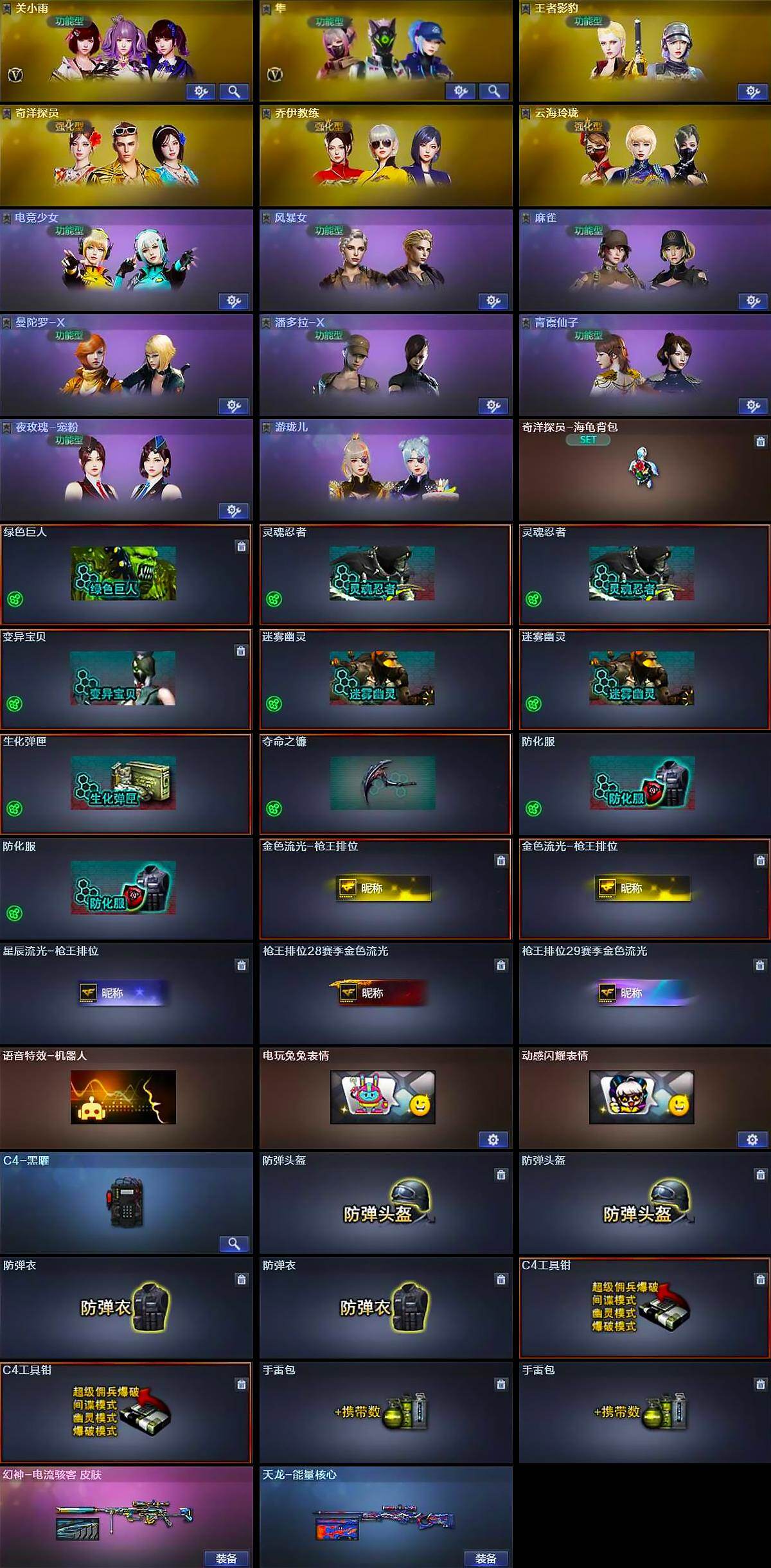 【道具】:奇洋探员-海龟背包,绿色巨人,灵魂忍者*2,变异宝贝,迷雾幽灵*2,生化弹匣,夺命之镰,防化服*2,金色流光-枪王排位*2,星辰流光-枪王排位,枪王排位28赛季金色流光,枪王排位29赛季金色流光,语音特效-机器人,电玩兔兔表情,动感闪耀表情,C4-黑曜,防弹头盔*2,防弹衣*2,C4工具钳*2,手雷包*2