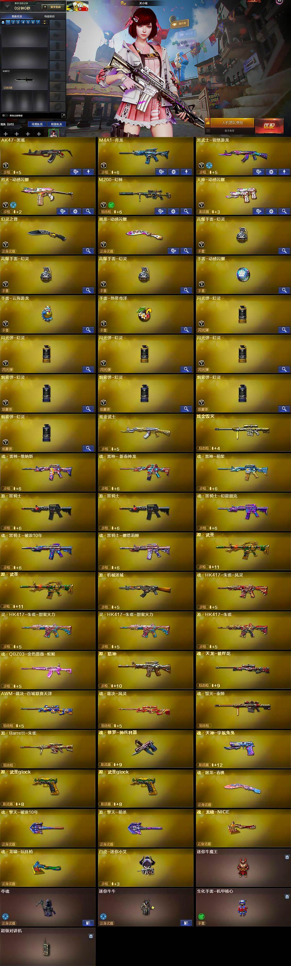 【英雄级武器】:AK47-黑鲨,M4A1-青龙,黑武士-锦绣游龙,烈火-动感闪耀,M200-幻神,天神-动感闪耀,幻灵之锋,屠龙-动感闪耀,高爆手雷-幻灵*3,手雷-动感闪耀,手雷-云海游龙,手雷-热带奇洋,闪光弹-幻灵*4,烟雾弹-幻灵*4