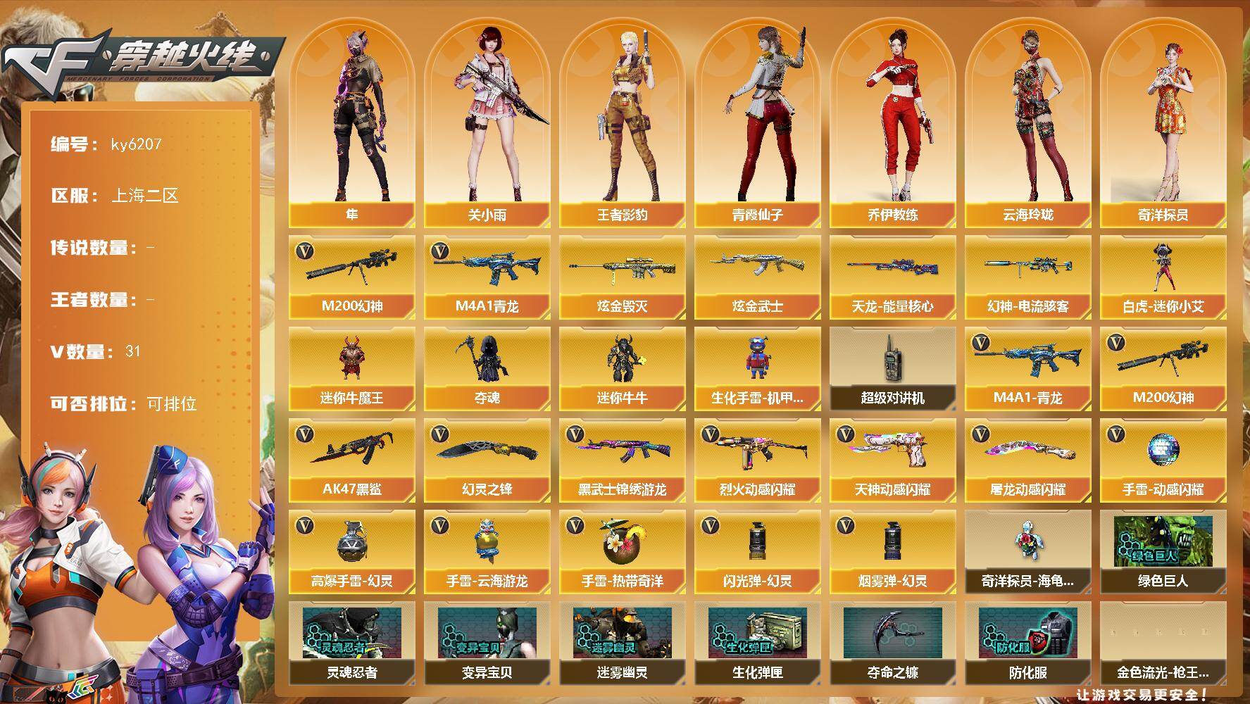 [17377533]上海二区-31V-0王者武器数-2炫金武器数 【热门武器】:M4A1-青龙,M200-幻神 【王者炫金武器】:炫金武士,炫金毁灭 【皮肤】:幻神-电流骇客 皮肤,天龙-能量核心 【角色】:关小雨,隼,王者影豹,奇洋探员,乔伊教练,云海玲珑,电竞少女,风暴女,麻雀,曼陀罗-X,潘多拉-X,青霞仙子,夜玫瑰-宠粉,游珑儿 【人偶武器】:白虎-迷你小艾,迷你牛魔王,夺魂,迷你牛牛,生化手雷-机甲核心 【暴走生化】:超级对讲机 【英雄级武器】:AK47-黑鲨,M4A1-青龙,黑武士-锦绣游龙,烈火-动感闪耀,M200-幻神,天神-动感闪耀,幻灵之锋,屠龙-动感闪耀,高爆手雷-幻灵*3,手雷-动感闪耀,手雷-云海游龙,手雷-热带奇洋,闪光弹-幻灵*4,烟雾弹-幻灵*4 【道具】:奇洋探员-海龟背包,绿色巨人,灵魂忍者*2,变异宝贝,迷雾幽灵*2,生化弹匣,夺命之镰,防化服*2,金色流光-枪王排位*2,星辰流光-枪王排位,枪王排位28赛季金色流光,枪王排位29赛季金色流光,语音特效-机器人,电玩兔兔表情,动感闪耀表情,C4-黑曜,防弹头盔*2,防弹衣*2,C4工具钳*2,手雷包*2 【特殊枪械】: