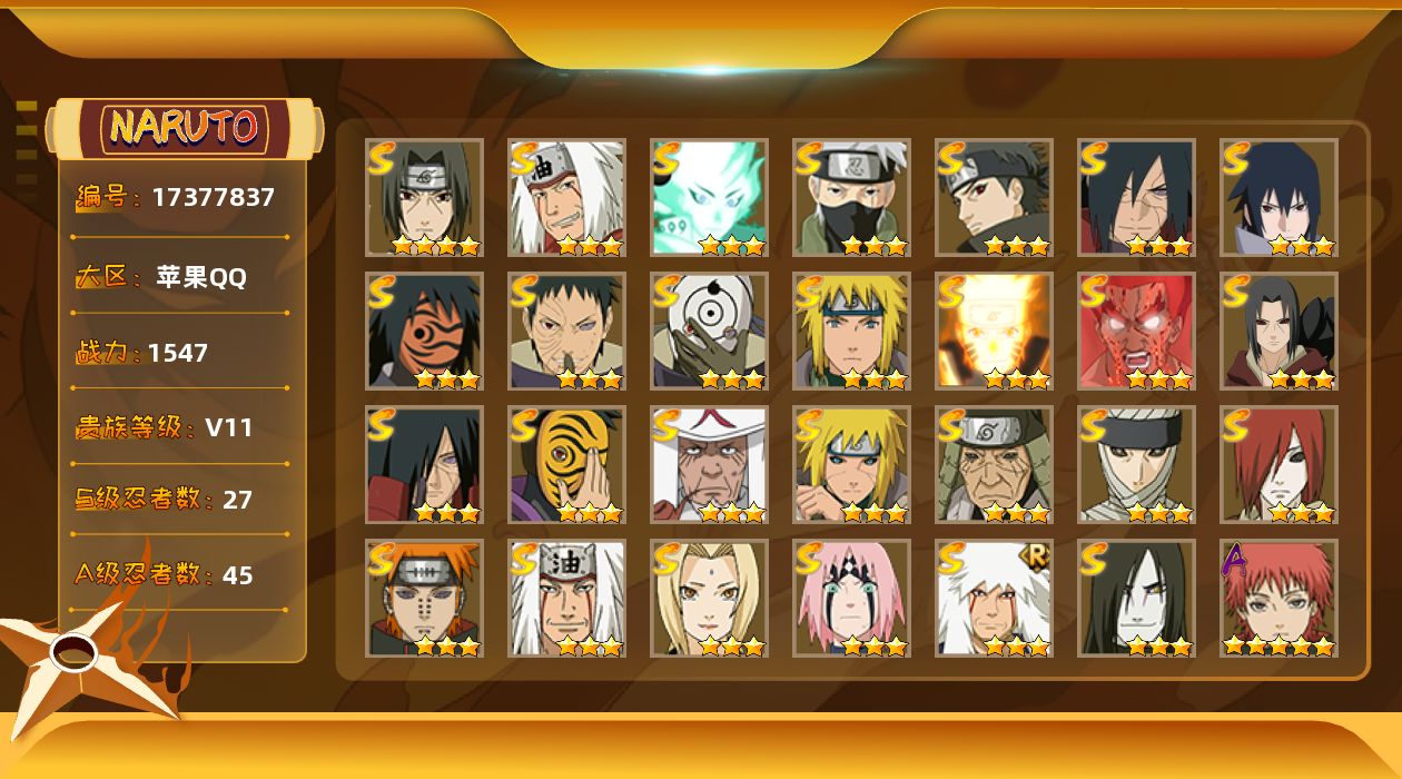 【S级忍者】:长门「秽土转生」(3星),猿飞日斩「秽土转生」(3星),波风水门「秽土转生」(3星),宇智波鼬「秽土转生」(3星),宇智波斑「秽土转生」(3星),宇智波斑「秽土转生·解」(3星),春野樱「忍界大战」(3星),宇智波带土「忍界大战」(3星),宇智波鼬「须佐能乎」(4星),宇智波止水「须佐能乎」(3星),旗木卡卡西「须佐能乎」(3星),无「二代目土影」(3星),自来也(3星),自来也「舞之豪杰」(3星),大蛇丸(3星),自来也「传说中的三忍」(3星),纲手(3星),猿飞日斩(3星),波风水门(3星),神秘面具男(3星),神秘面具男「红夜之刃」(3星),漩涡鸣人「九喇嘛连结」(3星),迈特凯「死门」(3星),佩恩「天道」(3星),宇智波佐助「永恒万花筒」(3星),宇智波斑 「白面具」(3星宇智波斑「白面具」),大筒木舍人「最终章」(3星)