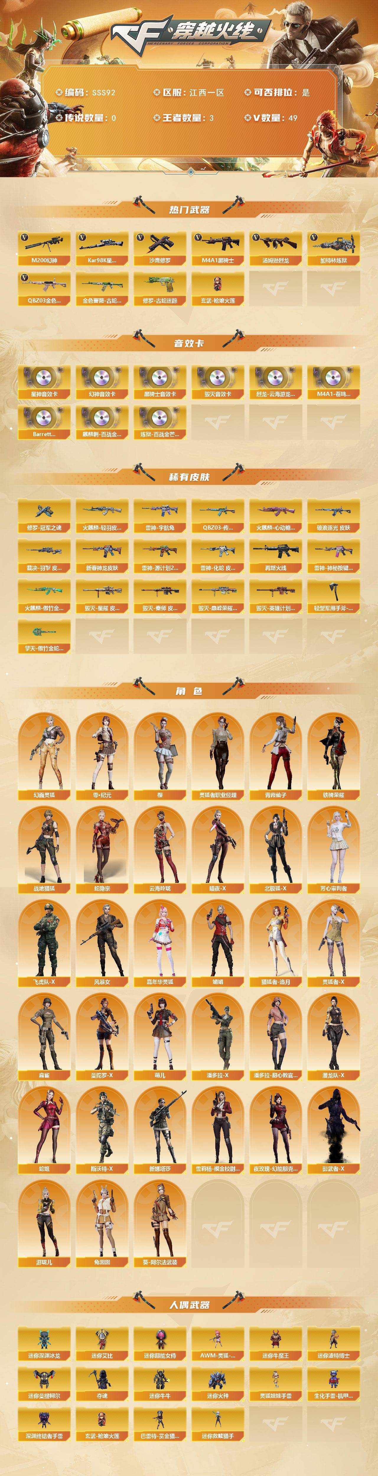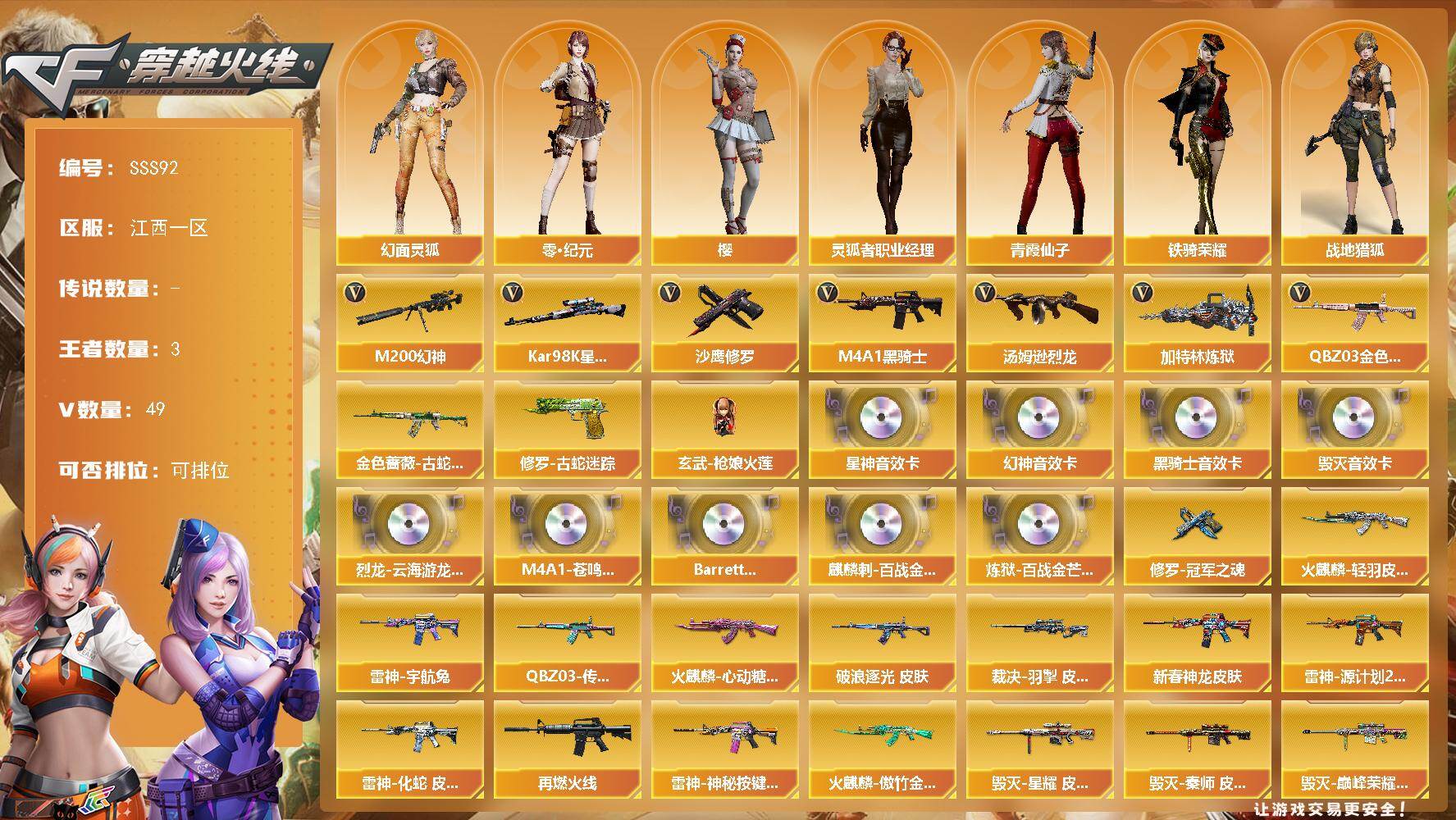 [17378653]江西一区-51V-3王者武器数-0炫金武器数 【热门武器】:QBZ03-金色蔷薇,M200-幻神,金色蔷薇-古蛇迷踪,修罗-古蛇迷踪,Kar98K-星神,M4A1-黑骑士*2,汤姆逊-烈龙,加特林-炼狱*2,玄武-枪娘火莲,沙鹰-修罗*2 【音效卡】:烈龙-云海游龙音效卡,M200-幻神音效卡,M4A1-黑骑士音效卡,Barrett-毁灭音效卡,Kar98K-星神音效卡,M4A1-苍鸣雷神音效卡,Barrett-碧霄极光音效卡,麒麟刺-百战金芒-盛典舞曲音效卡,炼狱-百战金芒-庆典舞曲音效卡 【皮肤】:QBZ03-传奇宠儿,金色蔷薇-破浪逐光 皮肤,裁决-羽掣 皮肤,雷神-宇航兔皮肤,M4A1-雷神-新春神龙皮肤,雷神-源计划2.0专属 皮肤,雷神-化蛇 皮肤,M4A1-再燃火线,雷神-神秘按键 皮肤,火麒麟-轻羽皮肤,火麒麟-心动糖果,火麒麟-傲竹金蛇 皮肤,毁灭-星耀 皮肤,毁灭-秦师 皮肤,毁灭-巅峰荣耀 皮肤,毁灭-英雄计划 皮肤,修罗-冠军之魂,轻型军用手斧-再燃火线,擎天-傲竹金蛇 皮肤 【角色】:樱,零·纪元,战地猎狐,蛇隐宗,云海玲珑,葵-阿尔法武装,幻面灵狐,暗夜-X,北极狐-X,芳心审判者,飞虎队-X,风暴女,嘉年华灵狐,娟娟,猎狐者-追月,灵狐者-X,灵狐者-职业经理,麻雀,曼陀罗-X,萌儿,潘多拉-X,潘多拉-甜心教官,潜龙队-X,青霞仙子,蛇姬,斯沃特-X,铁骑荣耀,兔囡囡,新娜塔莎,雪莉杨-摸金校尉,夜玫瑰-幻能朋克,影武者-X,游珑儿 【人偶武器】:玄武-枪娘火莲,迷你救赎猎手,AWM-灵狐-15周年嘉年华*3,迷你深渊冰龙,迷你牛魔王,迷你波特博士,迷你曼提柯尔,夺魂,迷你牛牛,迷你火种,生化手雷-机甲核心,深渊终结者手雷*2,巴雷特-赏金猎人,迷你艾比,迷你超能女侍,灵狐娃娃手雷 【暴走生化】:超级对讲机 【挑战大师】:神圣爆裂者III,AK47-冰龙粉碎者,冰龙粉碎者-白马银枪*3,激光毁灭者III-白马银枪*2,激光毁灭者III,机甲撕裂者III*2,试炼破坏者III*2,神圣爆裂者-末日III*4,惩戒者III 【英雄级武器】:AK47-火麒麟,M4A1-雷神,M4A1-黑骑士*2,AK12-天启,AN94-超新星,无影-神兵利器,黑武士-锦绣游龙,金色蔷薇-古蛇迷踪,QBZ03-金色蔷薇,王者之魄-觉醒版,黑骑士-海王*2