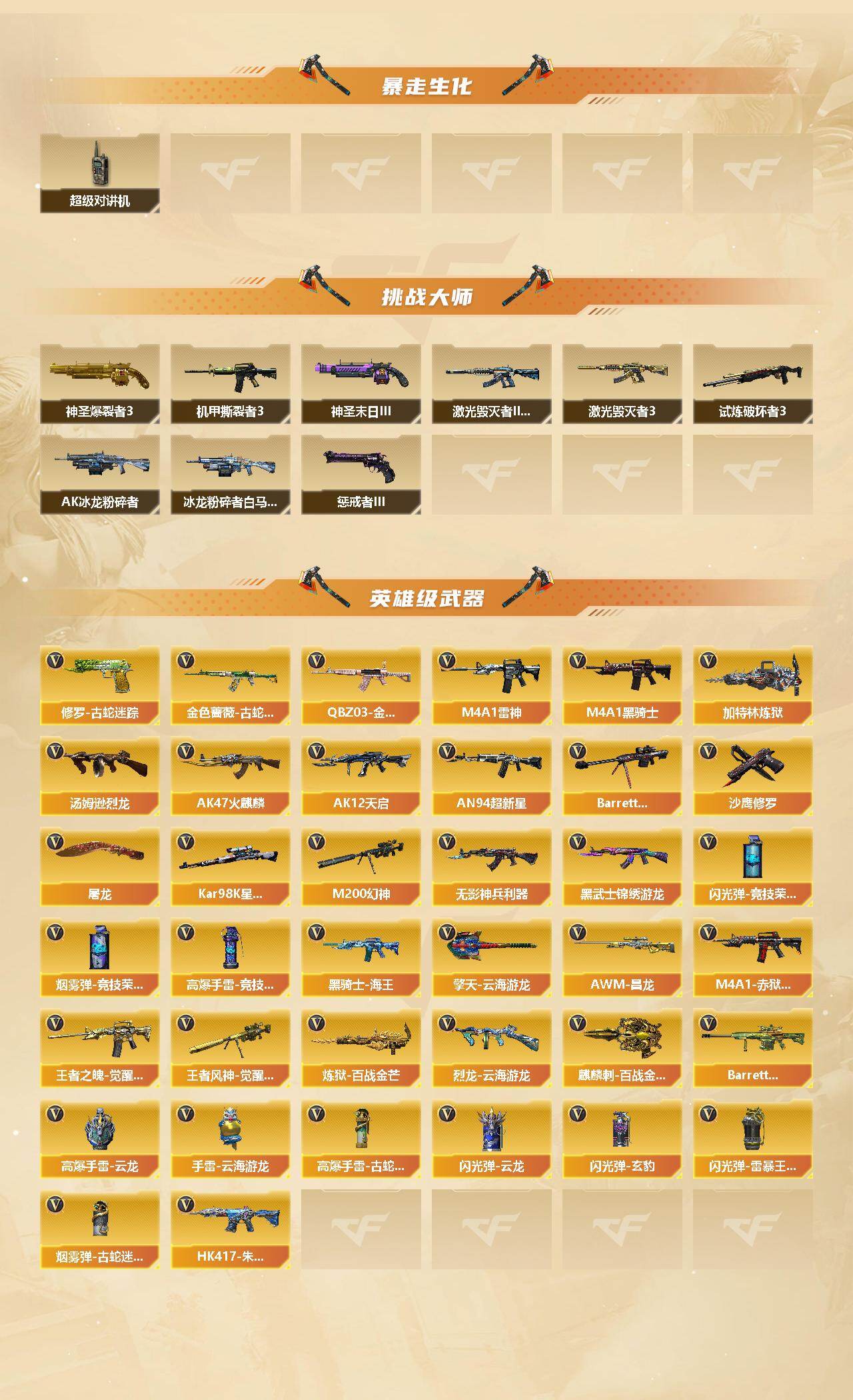 【英雄级武器】:AK47-火麒麟,M4A1-雷神,M4A1-黑骑士*2,AK12-天启,AN94-超新星,无影-神兵利器,黑武士-锦绣游龙,金色蔷薇-古蛇迷踪,QBZ03-金色蔷薇,王者之魄-觉醒版,黑骑士-海王*2