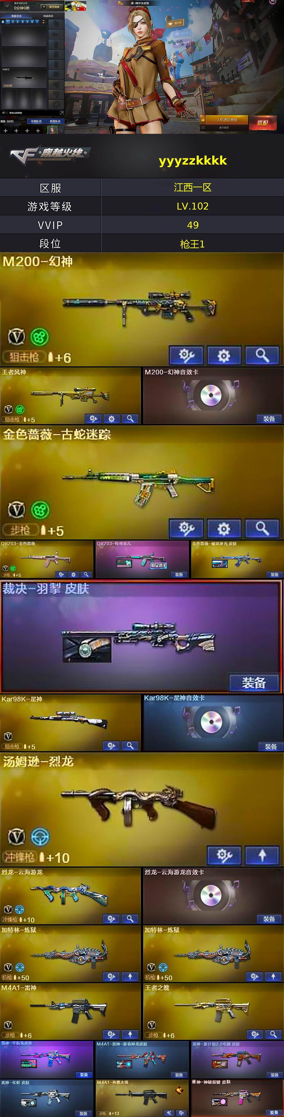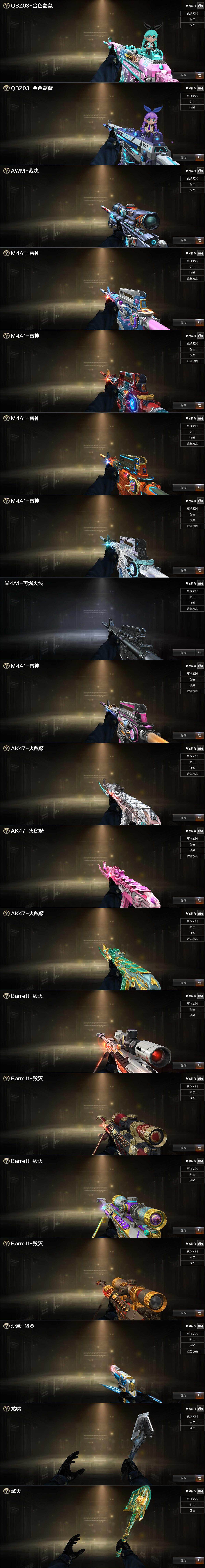 【热门武器】:QBZ03-金色蔷薇,M200-幻神,金色蔷薇-古蛇迷踪,修罗-古蛇迷踪,Kar98K-星神,M4A1-黑骑士*2,汤姆逊-烈龙,加特林-炼狱*2,玄武-枪娘火莲,沙鹰-修罗*2