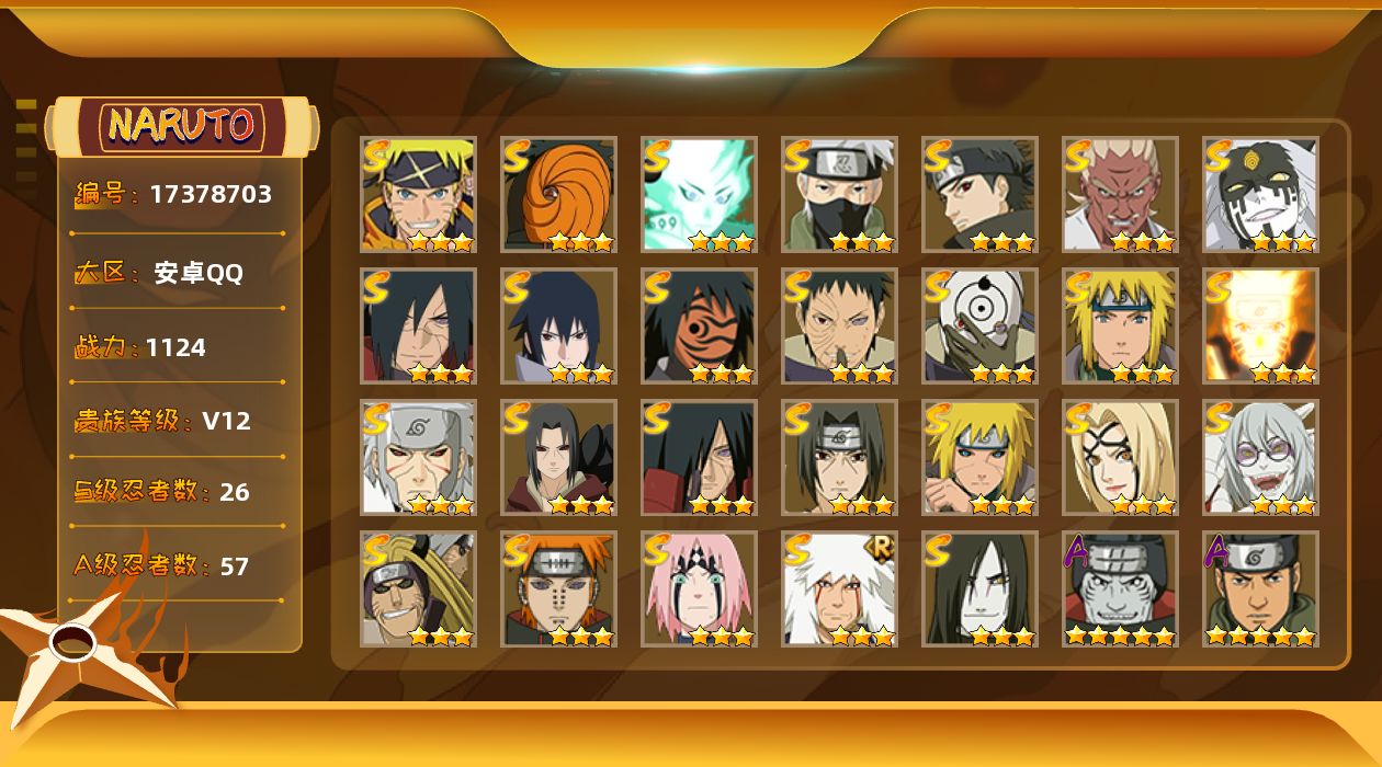 - [16332280]6S级忍者数-15A级忍者数 【S级忍者】:宇智波斑「秽土转生·解」(3星),宇智波鼬「须佐能乎」(3星),自来也「舞之豪杰」(3星),波风水门(3星),佩恩「天道」(3星),漩涡鸣人·宇智波佐助(3星) 【A级忍者】:干柿鬼鲛(2星),漩涡博人「桃式显现」(2星),漩涡鸣人「九尾查克拉」(2星),机械鸣人「初始形态」(2星),迈特凯(2星),旗木卡卡西「忍界大战」(2星),旗木卡卡西「幻之真容」(2星),我爱罗「疾风传」(2星),蝎(2星),宇智波鼬(2星),佩恩·六道「漂泊浪客」(2星),黑土「博人传」(2星),千代「近松十人卫」(2星),宇智波泉奈(2星),迈特凯「青春爆炸」(2星)