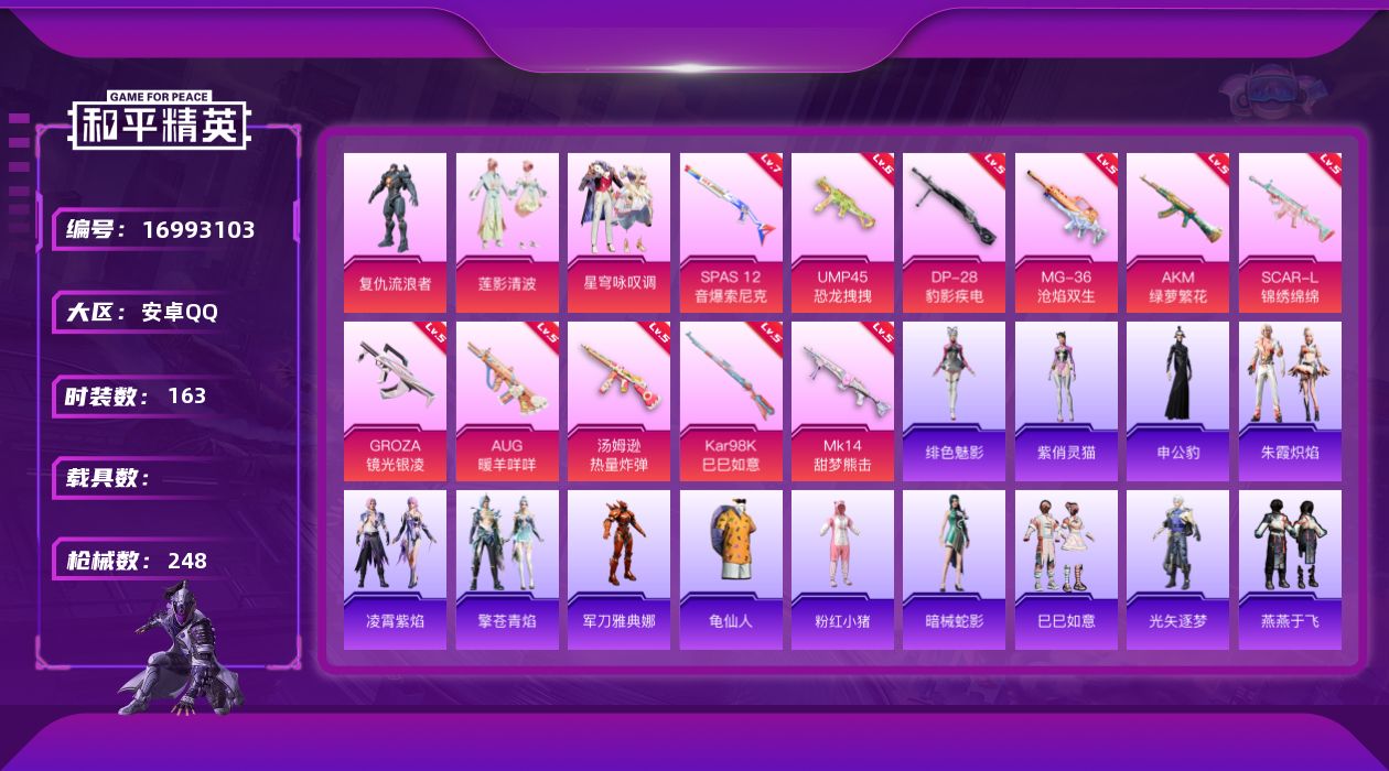 [16993103]安卓 手Q-3粉装-11特效枪-0载具-2粉色飞行器-69522热力值-14王牌印记-163套装-248枪皮