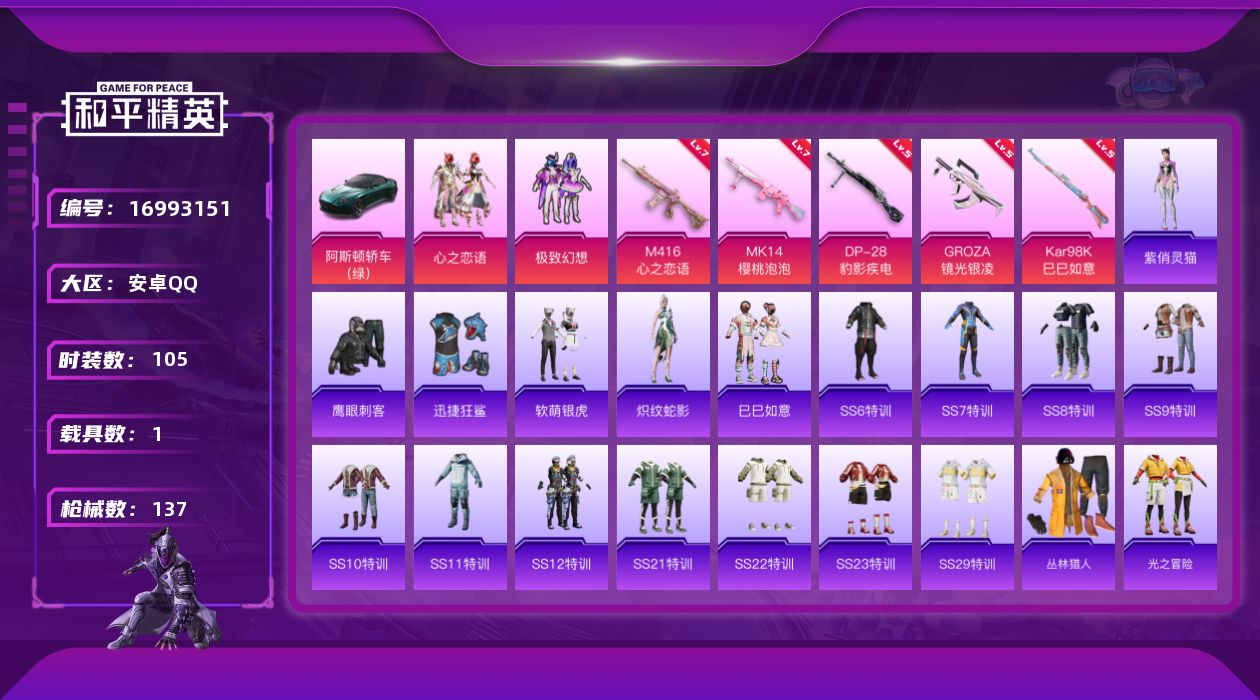 [16993151]安卓 手Q-2粉装-5特效枪-1载具-1粉色飞行器-44486热力值-4王牌印记-105套装-137枪皮
