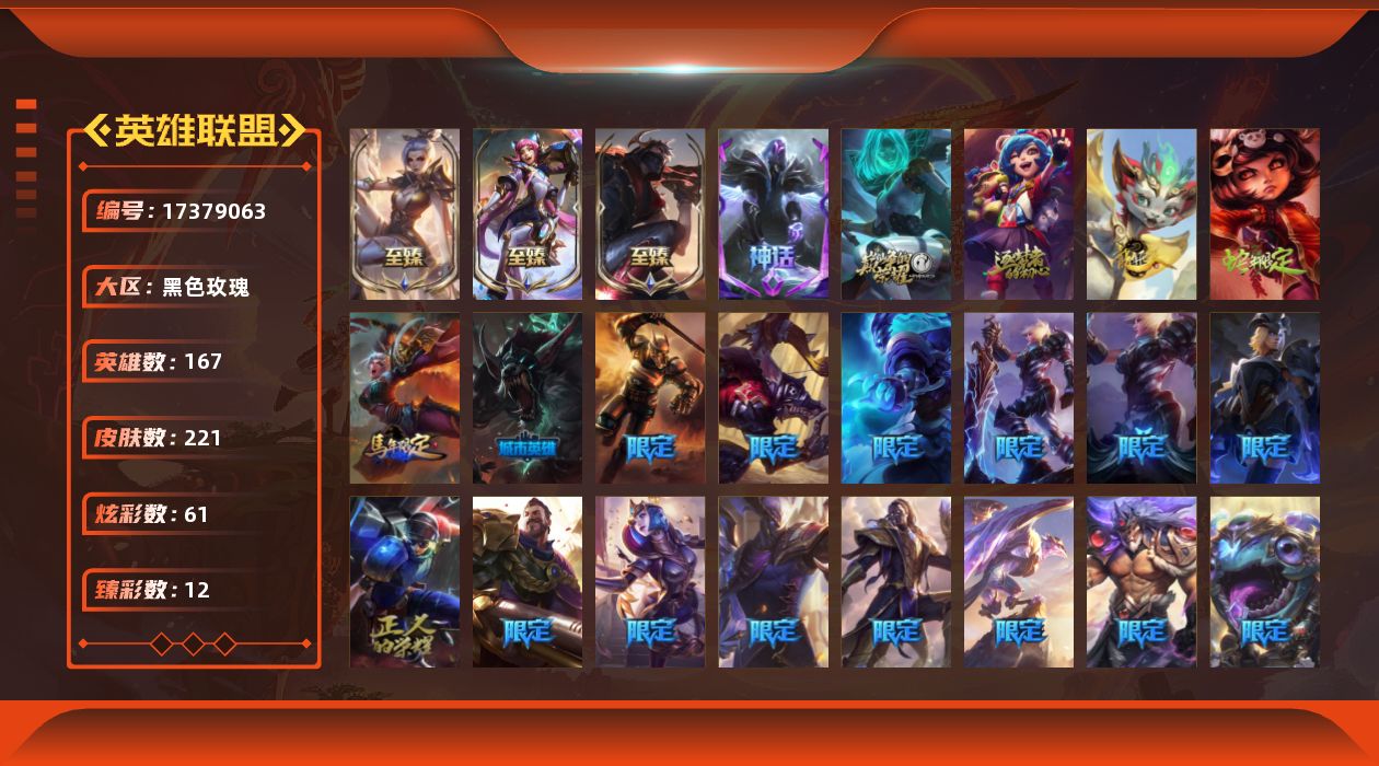 [17379063]未定级段位-167英雄-221皮肤-61炫彩-0终极-7神话-45限定-19传说-51史诗