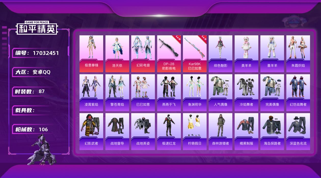 [17032451]安卓 手Q-3粉装-5特效枪-0载具-1粉色飞行器-27454热力值-3王牌印记-87套装-106枪皮 【粉色套装】:角色-洛天依,粉装-幻彩电音,粉装-极意拳锋 【粉色枪皮等级】:AKS-74U-森灵之息(四级),Kar98K-巳巳如意(五级),DP-28-豹影疾电(五级) 【粉色枪皮】:AKS-74U-森灵之息,Kar98K-巳巳如意,Mk14-福马献瑞,DP-28-豹影疾电 【粉色飞行器】:炫彩糖果飞行器 【粉色降落伞】:江南烟雨降落伞,精灵梦叶罗丽降落伞,金丰海韵降落伞,异瞳寒姬降落伞,炫彩糖果降落伞 【稀有套装】:套装-巳巳如意,套装-雪国风尚,套装-炫彩糖果,套装-燕燕于飞,套装-鱼渊荷华,套装-朱霞炽焰,套装-凌霄紫焰,套装-擎苍青焰,玩偶服-美羊羊,玩偶服-喜羊羊,角色-绯色魅影,套装-雨过天青,套装-红釉青花,角色-霜纹水星 【稀有枪皮】:AUG-冰晶雪宝,AKM-破晓战魂,SCAR-L-夜灯,SCAR-L-炫彩节奏,M416-红色方程式,M416-蓝色火焰,AUG-耀粉歌者,AUG-闲梦青缨,ARX-凌霄紫焰,UZI-炫彩节奏,UZI-红色方程式,UZI-幻影飞狐,UMP45-夜灯,Vector-生命誓言,汤姆逊-天降萌叽,汤姆逊-奇异狩猎者,AKS-74U-极光猎影,JS9-凌霄紫焰,P90-巳巳如意,Mini14-绯穹魔姬,S686-生命誓言,S686-巳巳如意,S12K-玩趣呆呆,S12K-夜灯,DBS-月影灵韵,MG3-幻世战舞者,MG-36-凌霄紫焰,P92-凌霄紫焰,R45-幻彩电音,短管霰弹-竹节火铳,平底锅-凌霄紫焰,破片手榴弹-巳巳如意 【其他套装】:套装-人气偶像,套装-冷焰舞者,套装-完美偶像,套装-幻世战舞者,套装-幻影武者,套装-战地督导,套装-战地英姿,套装-极速红龙,套装-柠萌假日,套装-森林游猎者,套装-橘黑制服,套装-海岛探路者,套装-深蓝色名流,套装-湖蓝色名流,套装-潮流炫酷,套装-灼焰舞者,套装-特训学院,套装-猎鹰,套装-猛禽,套装-王牌教练,套装-疯狂小兔子,套装-白熊同盟,套装-破晓战魂,套装-竞技达人朋克,套装-红色运动,套装-绮丽涂鸦,套装-缤纷果语,套装-耀粉歌者,套装-蓝彩潮人,套装-蓝色运动,套装-街头潮人,套装-都市魅力,套装-酒红色名流,套装-青年教官,套装-青春校园,套装-顽皮玉兔,