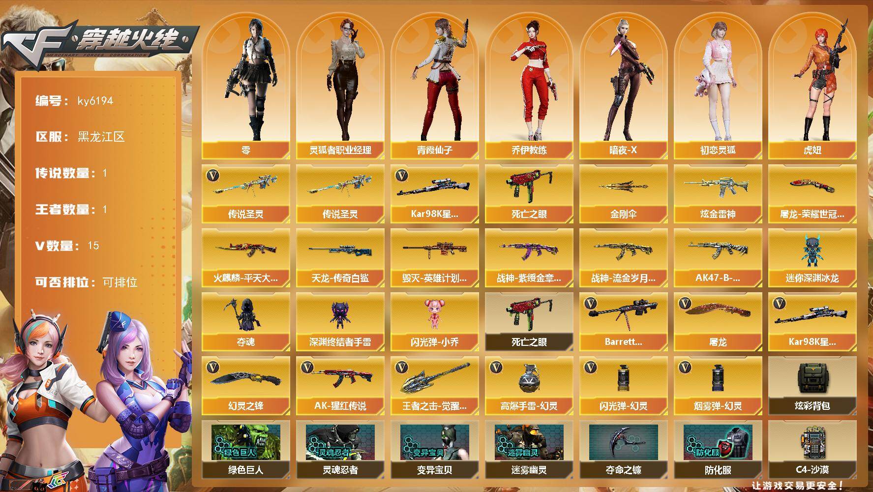 [17379265]黑龙江区-16V-1王者武器数-1炫金武器数 【传说武器】:传说圣灵 【热门武器】:传说圣灵,死亡之眼,Kar98K-星神,金刚伞 【王者炫金武器】:炫金雷神 【皮肤】:火麒麟-平天大圣,毁灭-英雄计划 皮肤,战神-紫绶金章皮肤,战神-流金岁月皮肤,AK47-B-常胜将军-刘备,AWM-天龙-传奇白鲨,屠龙-荣耀世冠AG 【角色】:零,乔伊教练,暗夜-X,初恋灵狐,虎妞,娟娟,灵狐者-七夕宝贝,灵狐者-职业经理,龙儿-小淘气,麻雀,潘多拉-X,潘多拉-甜心教官,青霞仙子,新娜塔莎,雪莉杨-摸金校尉,樱-战斗天使 【人偶武器】:迷你深渊冰龙,夺魂,深渊终结者手雷,闪光弹-小乔 【暴走生化】:死亡之眼 【英雄级武器】:AK-47-猩红传说*2,Barrett-毁灭,Kar98K-星神,屠龙*2,幻灵之锋,王者之击-觉醒版,高爆手雷-幻灵,闪光弹-幻灵*3,烟雾弹-幻灵 【道具】:炫彩背包,绿色巨人,灵魂忍者,变异宝贝,迷雾幽灵,夺命之镰,防化服*2,EP战队名片,C4-沙漠,防弹头盔*2,防弹衣*2,C4工具钳*2,手雷包*2 【特殊枪械】: