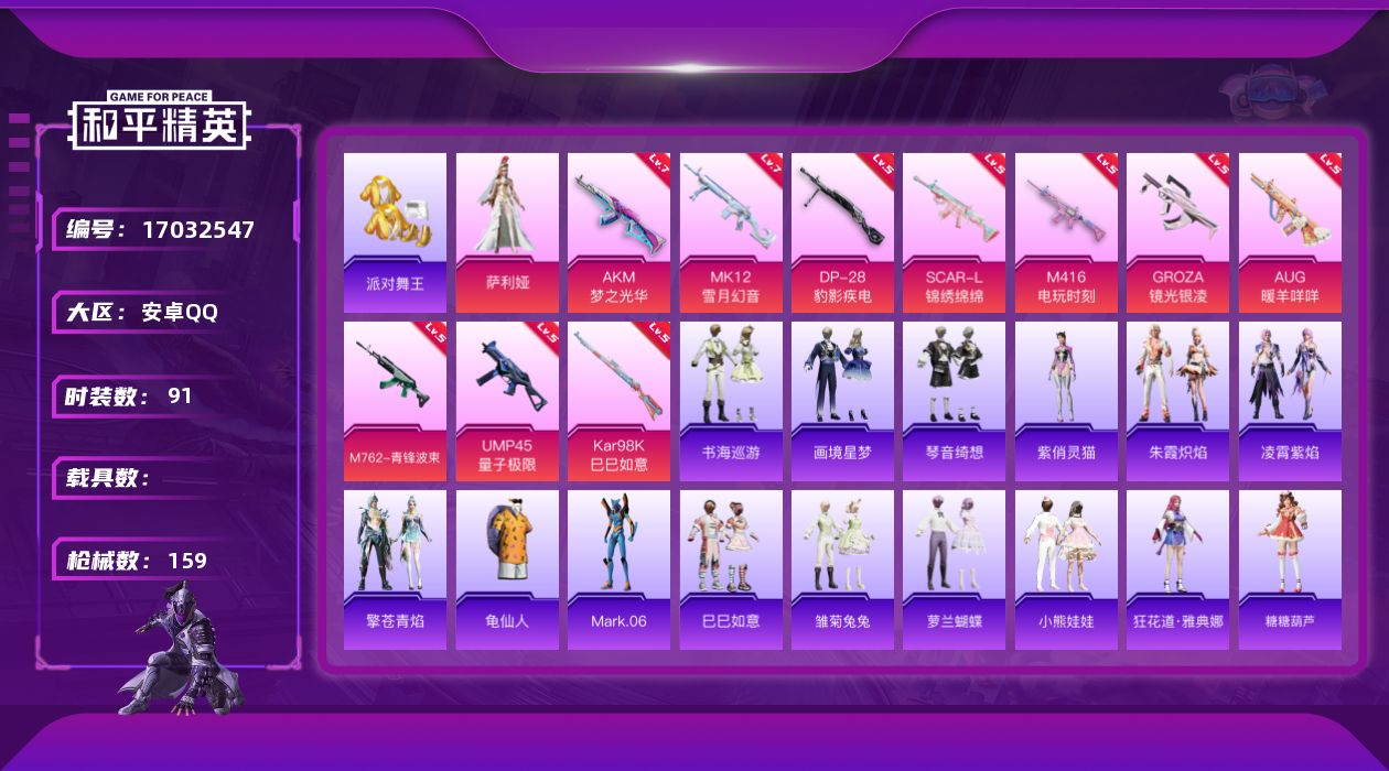 [17032547]安卓 手Q-1粉装-11特效枪-0载具-1粉色飞行器-49307热力值-12王牌印记-91套装-159枪皮 【热门品类】:套装-派对舞王,套装-龟仙人,角色-Mark.06 【粉色套装】:角色-萨利娅 【粉色枪皮等级】:AKM-梦之光华(七级),SCAR-L-锦绣绵绵(五级),M416-电玩时刻(五级),GROZA-镜光银凌(五级),AUG-暖羊咩咩(五级),M762-青锋波束(五级),UMP45-量子极限(五级),AKS-74U-森灵之息(五级),Kar98K-巳巳如意(五级),MK12-雪月幻音(七级),DP-28-豹影疾电(五级) 【粉色枪皮】:AKM-梦之光华,SCAR-L-锦绣绵绵,M416-电玩时刻,GROZA-镜光银凌,AUG-暖羊咩咩,M762-青锋波束,UMP45-量子极限,AKS-74U-森灵之息,Kar98K-巳巳如意,MK12-雪月幻音,DP-28-豹影疾电 【粉色飞行器】:炫彩糖果飞行器 【粉色降落伞】:星之彼岸降落伞,莲影清波降落伞,精灵梦叶罗丽降落伞,墨龙九天降落伞,创世·救赎降落伞,忍者神龟降落伞,千金淑猫降落伞,异瞳寒姬降落伞,炫彩糖果降落伞 【稀有套装】:套装-龟仙人,套装-巳巳如意,套装-雪国风尚,套装-炫彩糖果,套装-雏菊兔兔,套装-萝兰蝴蝶,套装-小熊娃娃,角色-狂花道·雅典娜,套装-糖糖葫芦,套装-青团波波,套装-棉花软糖,角色-俏兔智灵,套装-燕燕于飞,套装-鱼渊荷华,套装-朱霞炽焰,套装-凌霄紫焰,套装-擎苍青焰,角色-紫俏灵猫,套装-书海巡游,套装-画境星梦,套装-琴音绮想,角色-月烬之祷,套装-雨过天青,套装-红釉青花 【稀有枪皮】:AUG-冰晶雪宝,AKM-彩虹符号,AKM-星之彼岸,AKM-破晓战魂,AKM-龙的传人,SCAR-L-玉兔迎春,M416-糯团青竹,M416-蓝色火焰,AUG-天降萌叽,M762-天降萌叽,M762-彩虹符号,AC-VAL-快闪甜心,蜜獾-天降萌叽,ACE32-画境星梦,ARX-凌霄紫焰,UZI-啾咪啾咪,UZI-天降萌叽,Vector-焰鹰斗篷,Vector-生命誓言,汤姆逊-炫彩节奏,MP5K-画境星梦,JS9-凌霄紫焰,P90-快闪甜心,P90-巳巳如意,Kar98K-彩虹符号,AWM-焰鹰斗篷,VSS-星之彼岸,MK20-H-快闪甜心,M1加兰德-画境星梦,S686-生命誓