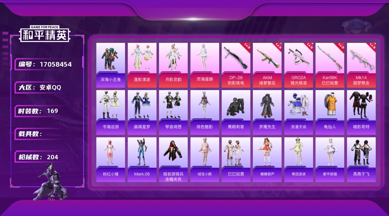 [17058454]安卓 手Q-3粉装-8特效枪-0载具-2粉色飞行器-58982热力值-12王牌印记-169套装-204枪皮