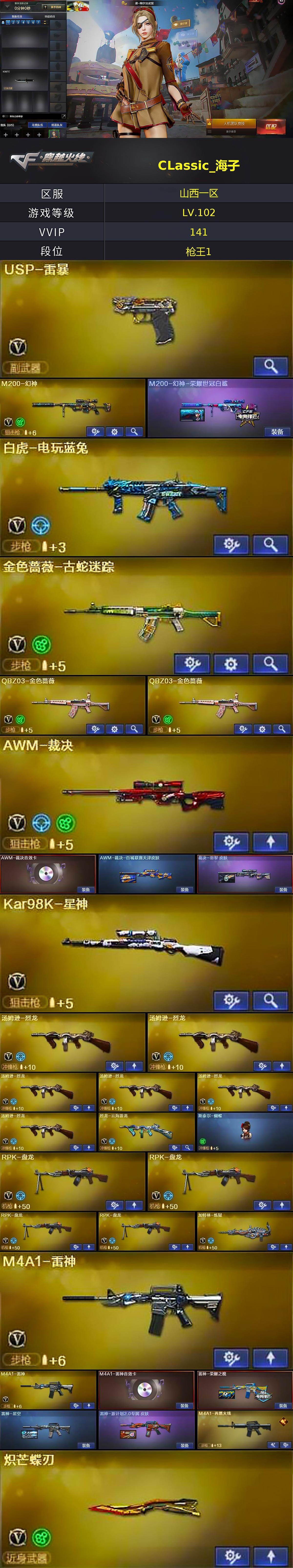 【热门武器】:QBZ03-金色蔷薇*2,M4A1-青龙,M200-幻神,金色蔷薇-古蛇迷踪,修罗-古蛇迷踪,白虎-电玩蓝兔,Kar98K-星神,金色小号,M4A1-黑骑士*2,汤姆逊-烈龙*6,RPK-盘龙*4,加特林-炼狱,斯泰尔-蝴蝶,火麒麟-绝迹,COP-白鲨,USP-雷暴,沙鹰-修罗*2,炽芒蝶刃