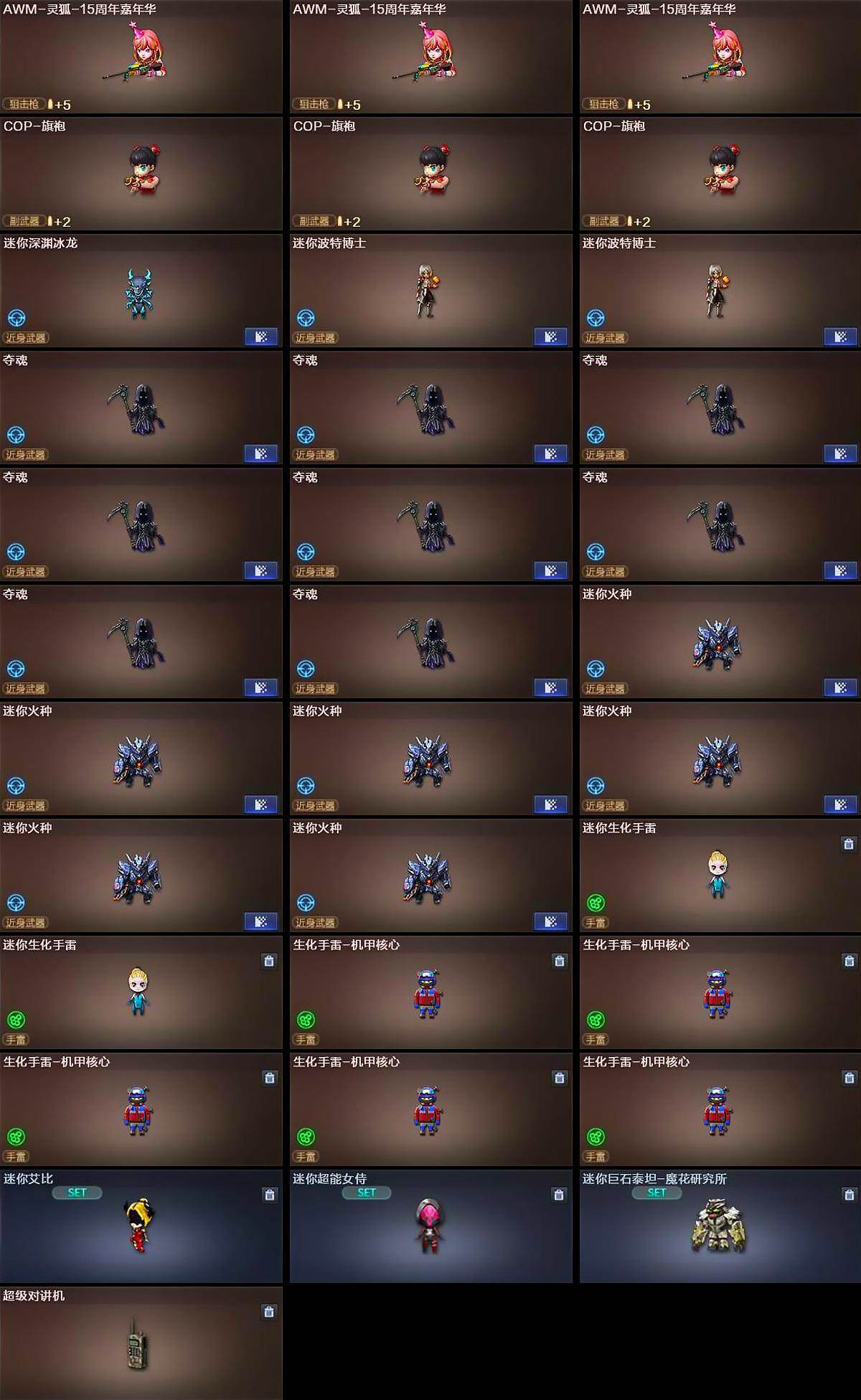 【人偶武器】:火麒麟-绝迹,COP-白鲨,M4A1-雷神-精英刀锋,斯泰尔-蝴蝶,巴雷特-零-水下丽影,AWM-灵狐-15周年嘉年华*3,COP-旗袍*3,迷你深渊冰龙,迷你波特博士*2,夺魂*8,迷你火种*6,迷你生化手雷*2,生化手雷-机甲核心*5,迷你艾比,迷你超能女侍,迷你巨石泰坦-魔花研究所