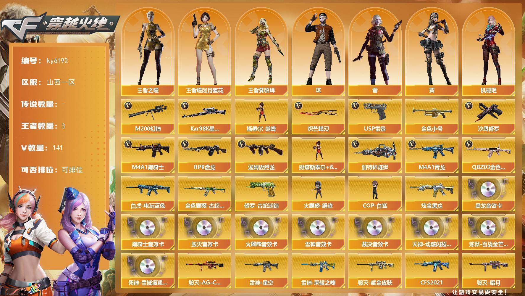 [17379475]山西一区-139V-3王者武器数-1炫金武器数 【热门武器】:QBZ03-金色蔷薇*2,M4A1-青龙,M200-幻神,金色蔷薇-古蛇迷踪,修罗-古蛇迷踪,白虎-电玩蓝兔,Kar98K-星神,金色小号,M4A1-黑骑士*2,汤姆逊-烈龙*6,RPK-盘龙*4,加特林-炼狱,斯泰尔-蝴蝶,火麒麟-绝迹,COP-白鲨,USP-雷暴,沙鹰-修罗*2,炽芒蝶刃 【王者炫金武器】:炫金黑龙 【音效卡】:天神-动感闪耀 音效卡,AK47-火麒麟音效卡,M4A1-雷神音效卡,M4A1-黑龙音效卡,M4A1-黑骑士音效卡,Barrett-毁灭音效卡,AWM-裁决音效卡,炼狱-百战金芒-庆典舞曲音效卡,死神-雪域霜狐-怀旧音效卡 【皮肤】:M200-幻神-荣耀世冠白鲨,AWM-裁决-百城联赛天津皮肤,裁决-羽掣 皮肤,雷神-荣耀之魄,雷神-星空,雷神-源计划2.0专属 皮肤,M4A1-再燃火线,火麒麟-平天大圣,火麒麟-巅峰荣耀,火麒麟-心动糖果,毁灭-暗月,毁灭耀金皮肤,毁灭-AG-CFPLS15冠军,毁灭-百城浙江 皮肤,黑龙-能量核心*2,黑骑士-CFS2021,战神-粉色甜心皮肤*3,战神-紫绶金章皮肤*11,战神-流金岁月皮肤*5,AK47-B-常胜将军-曹操,AWM-天龙-传奇70KG,AWM-天龙-传奇白鲨,炼狱-星空,轻型军用手斧-再燃火线,麒麟刺-甜蜜糖果 皮肤,麒麟刺-荣耀世冠白鲨 【角色】:葵,炫,春,机械姬,王者-瞳-闭月羞花,王者-葵-貂蝉,王者之瞳,雪域霜狐,蛇隐宗,奇洋探员,乔伊教练,修道士,云海玲珑,葵-阿尔法武装,暗夜-X,飞虎队-X,风暴女,嘉年华灵狐,兰-海滩派对,0号玩家,零-水下丽影,灵狐者-X,潘多拉-X,潜龙队-X,蛇姬,斯沃特-X,铁骑荣耀,兔囡囡,维纳斯,新娜塔莎,雪莉杨-摸金校尉,夜玫瑰-幻能朋克,影武者-X,游珑儿,智影 【人偶武器】:火麒麟-绝迹,COP-白鲨,M4A1-雷神-精英刀锋,斯泰尔-蝴蝶,巴雷特-零-水下丽影,AWM-灵狐-15周年嘉年华*3,COP-旗袍*3,迷你深渊冰龙,迷你波特博士*2,夺魂*8,迷你火种*6,迷你生化手雷*2,生化手雷-机甲核心*5,迷你艾比,迷你超能女侍,迷你巨石泰坦-魔花研究所 【暴走生化】:超级对讲机 【挑战大师】:神圣爆裂者III,试炼破坏者III,阐释者III 【英雄级武器】:M4