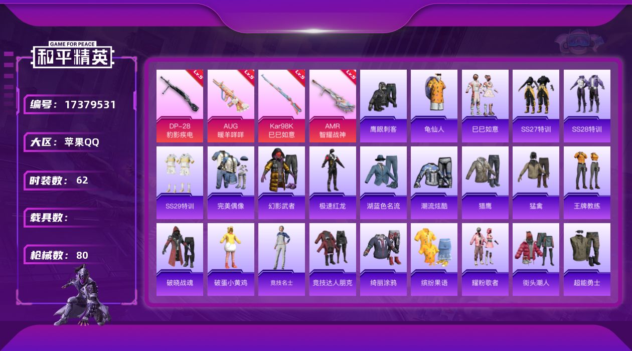 [17379531]苹果 手Q-0粉装-6特效枪-0载具-1粉色飞行器-22100热力值-1王牌印记-62套装-80枪皮