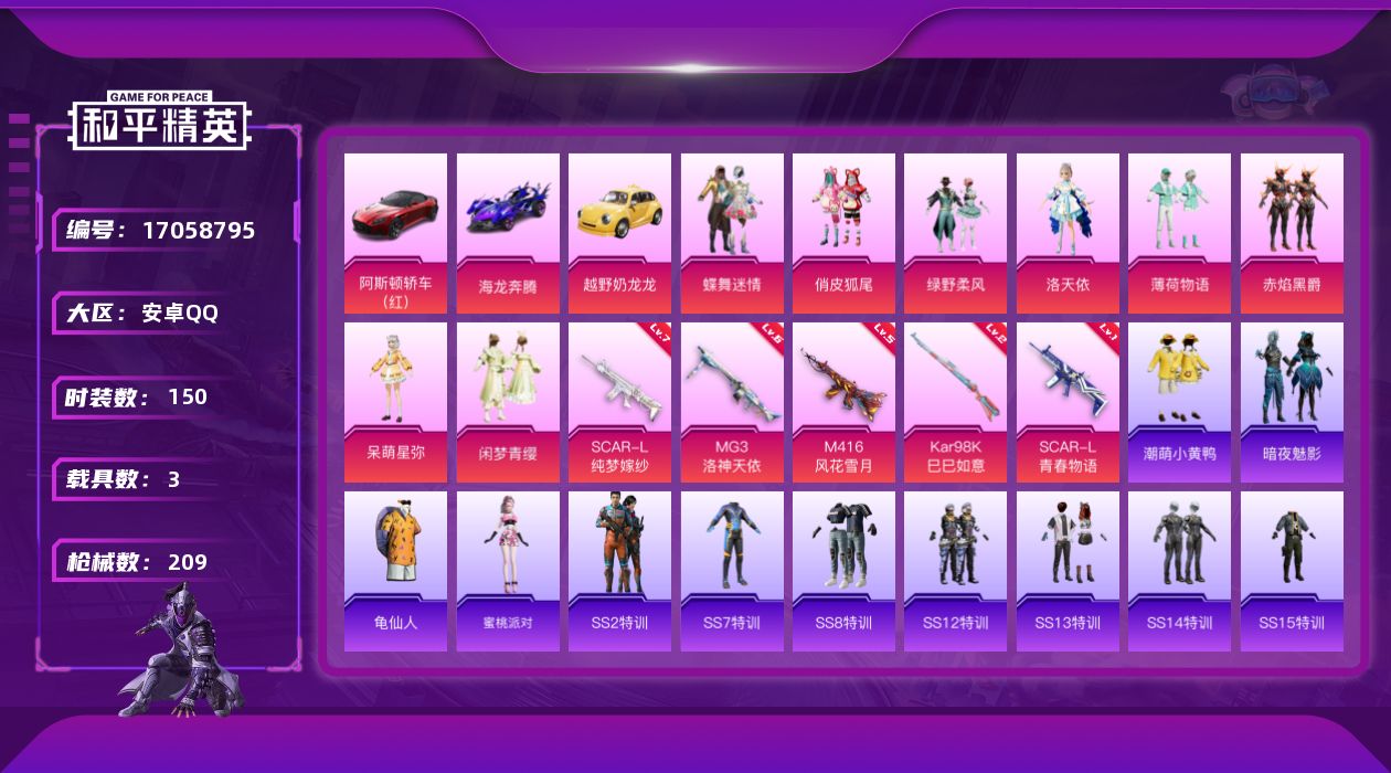 [17058795]安卓 手Q-8粉装-5特效枪-3载具-4粉色飞行器-72728热力值-1王牌印记-150套装-209枪皮