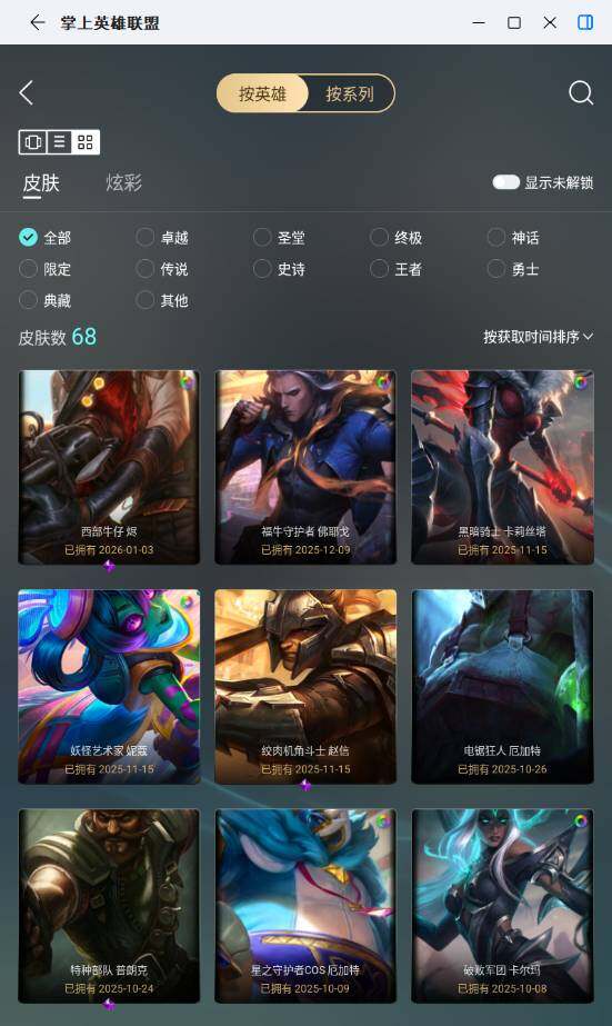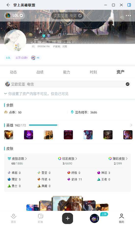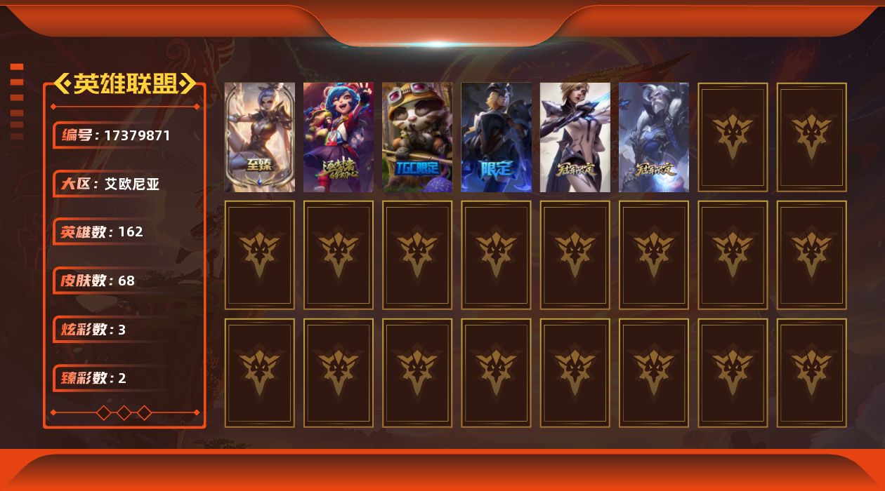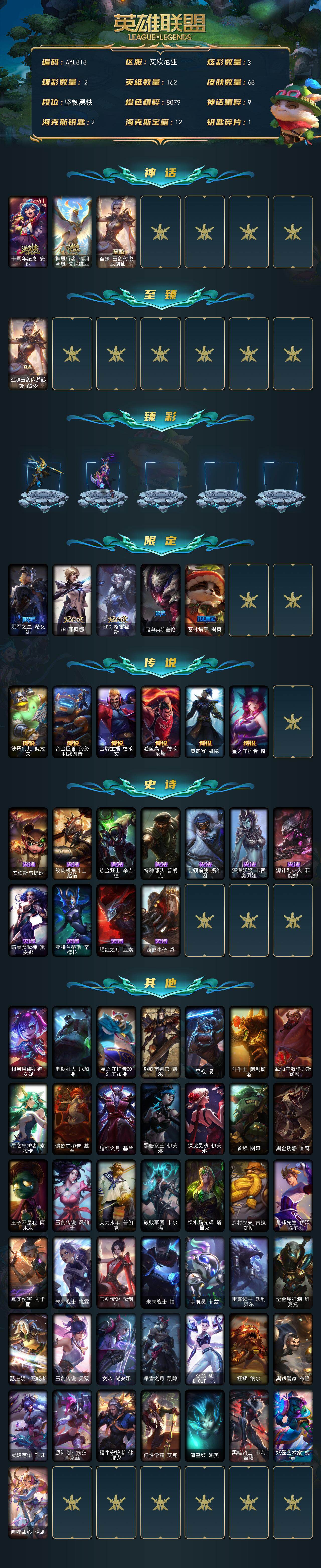 [17379871]未定级段位-162英雄-68皮肤-3炫彩-0终极-3神话-5限定-6传说-11史诗