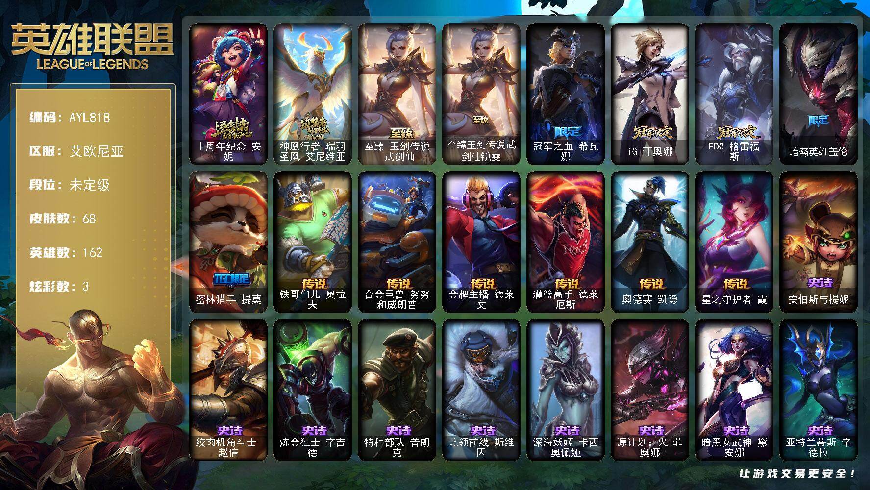 [17379871]未定级段位-162英雄-68皮肤-3炫彩-0终极-3神话-5限定-6传说-11史诗 【神话皮肤】:十周年纪念安妮,神凰行者瑞羽圣凰艾尼维亚,至臻玉剑传说武剑仙 【至臻皮肤】:至臻玉剑传说武剑仙锐雯 【臻彩皮肤】:冠军之矛卡莉丝塔凯旋圣装,星之守护者金克丝黑洞 【限定皮肤】:冠军之血希瓦娜,iG菲奥娜,EDG格雷福斯,暗裔英雄盖伦,密林猎手提莫 【传说皮肤】:铁哥们儿奥拉夫,合金巨兽努努和威朗普,金牌主播德莱文,灌篮高手德莱厄斯,奥德赛凯隐,星之守护者霞 【史诗皮肤】:安伯斯与提妮,绞肉机角斗士赵信,炼金狂士辛吉德,特种部队普朗克,北领前线斯维因,深海妖姬卡西奥佩娅,源计划火菲奥娜,暗黑女武神黛安娜,亚特兰蒂斯辛德拉,腥红之月亚索,西部牛仔烬 【其他皮肤1】:银河魔装机神安妮,电锯狂人厄加特,星之守护者COS厄加特,钢铁审判官凯尔,星战易,斗牛士阿利斯塔,武仙座海格力斯赛恩,星之守护者索拉卡,遗迹守护者基兰,腥红之月基兰,黑暗女王伊芙琳,探戈灵魂伊芙琳,首领图奇,黑金诱惑图奇,王子不是我阿木木,玉剑传说风仙子,大力水手普朗克,破败军团卡尔玛,绿水晶光辉塔里克,乡村农夫古拉加斯,足球先生伊泽瑞尔,真实伤害阿卡丽,未来战士锐雯,玉剑传说武剑仙,未来战士慎,宇航员菲兹,雷霆领主沃利贝尔,全金属狂潮维克托,瑟庄妮逐晓者,玉剑传说无双,女帝黛安娜,净雪之月凯隐,KDAALLOUT卡莎,狂狮纳尔,黑帮管家布隆,灵魂莲华千珏,源计划疯狂金克丝,福牛守护者佛耶戈,任性学霸艾克,海皇姬娜美,黑暗骑士卡莉丝塔,妖怪艺术家妮蔻,咖啡甜心格温