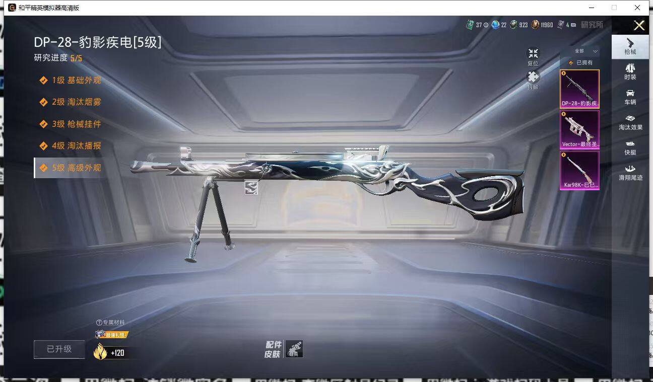 【粉色枪皮等级】:Vector-最终圣卫者(三级),Kar98K-巳巳如意(五级),DP-28-豹影疾电(五级)