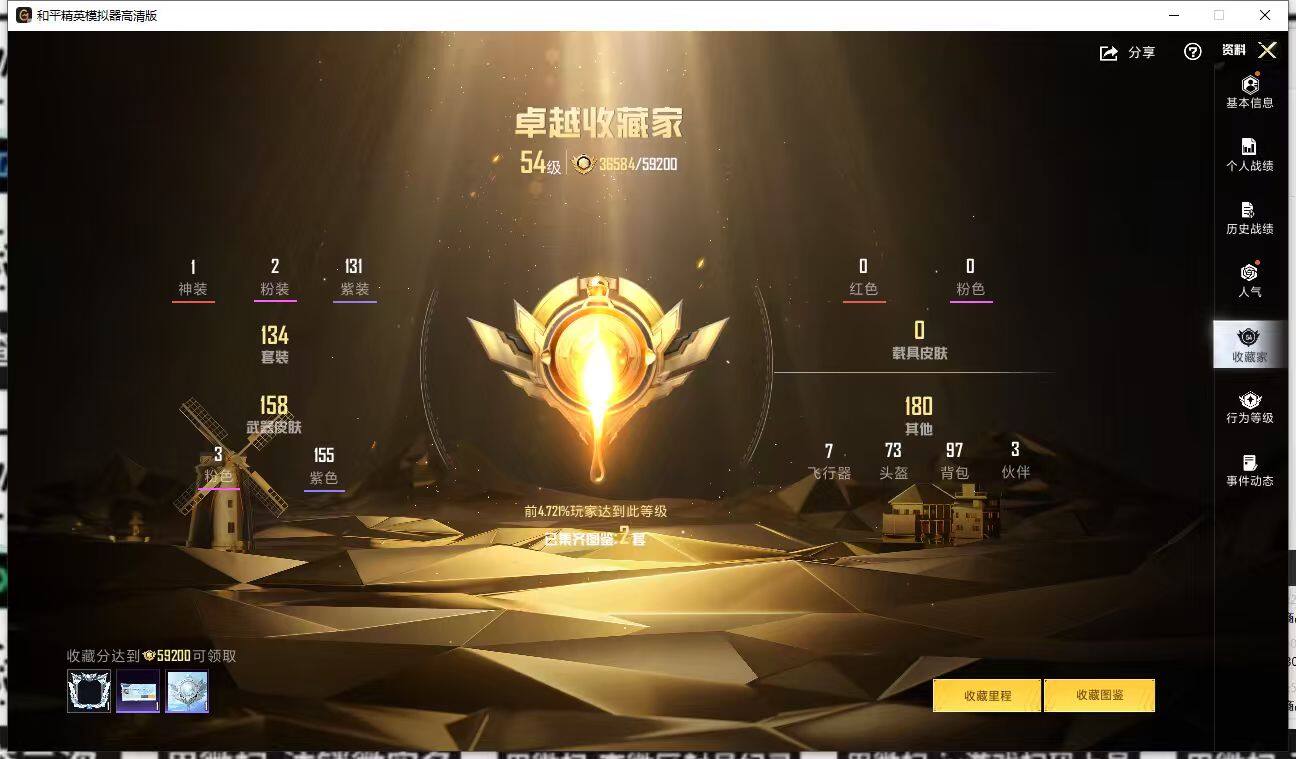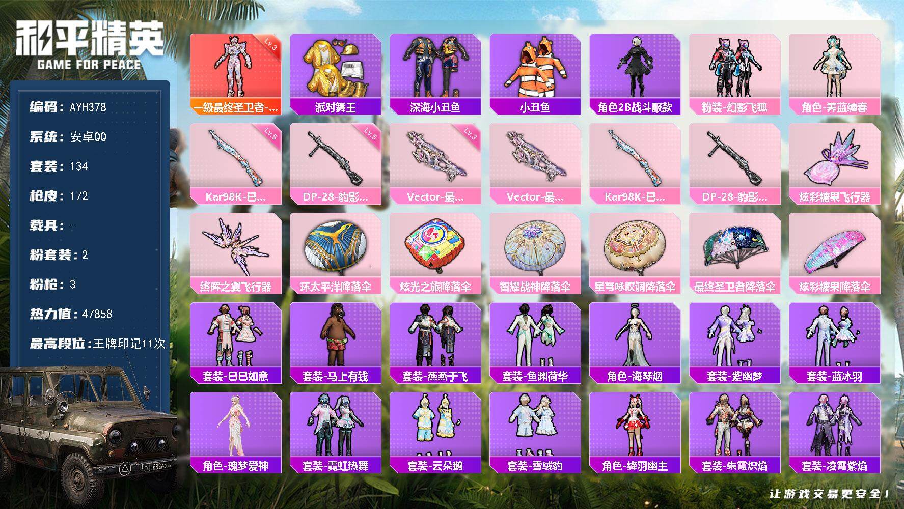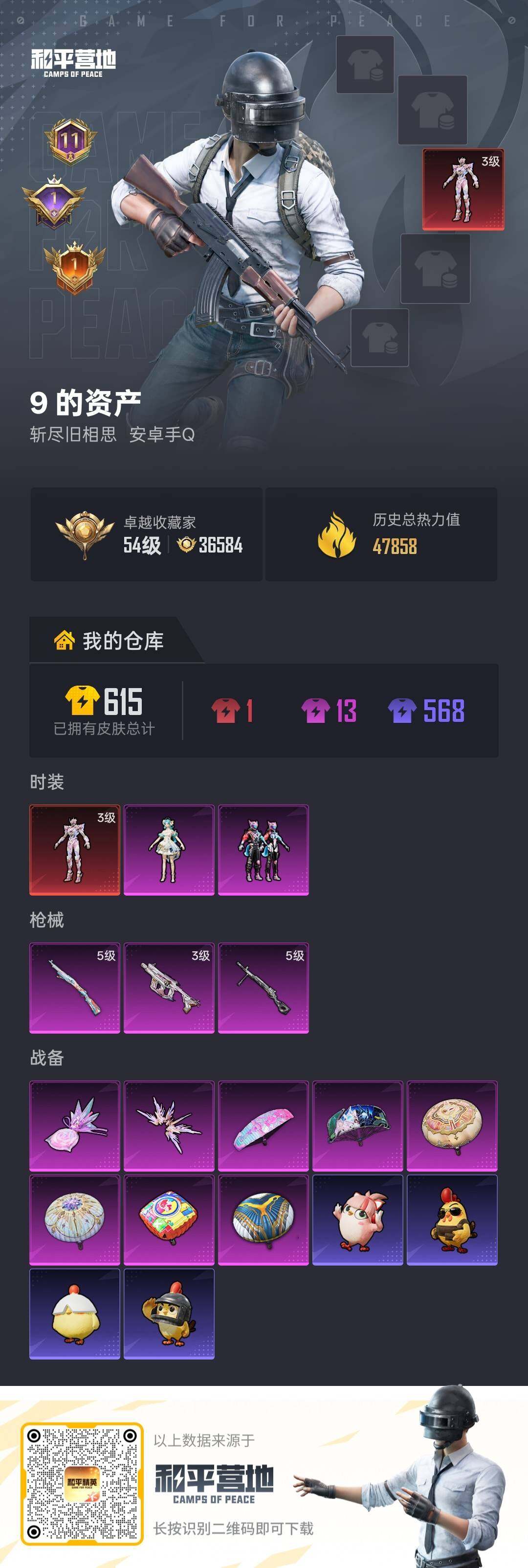 安卓 手Q-1神装-2粉装-3特效枪-0载具-2粉色飞行器-47858热力值-11王牌印记-134套装-172枪皮