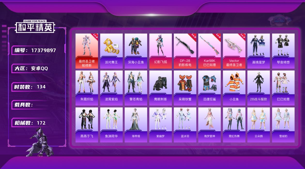 [17379897]【特价出售/店主推荐】 安卓 手Q-1神装-2粉装-3特效枪-0载具-2粉色飞行器-47858热力值-11王牌印记-134套装-172枪皮 【红色神装等级】:最终圣卫者-帕修斯(三级) 【红色角色神装】:最终圣卫者-帕修斯 【热门品类】:套装-派对舞王,套装-深海小丑鱼,套装-小丑鱼,角色-2B战斗服款 【粉色套装】:粉装-幻影飞狐,角色-霁蓝缠春 【粉色枪皮等级】:Vector-最终圣卫者(三级),Kar98K-巳巳如意(五级),DP-28-豹影疾电(五级) 【粉色枪皮】:Vector-最终圣卫者,Kar98K-巳巳如意,DP-28-豹影疾电 【粉色飞行器】:炫彩糖果飞行器,终晖之翼飞行器 【粉色降落伞】:环太平洋降落伞,炫光之旅降落伞,智耀战神降落伞,星穹咏叹调降落伞,最终圣卫者降落伞,炫彩糖果降落伞 【稀有套装】:套装-巳巳如意,套装-炫彩糖果,套装-马上有钱,套装-燕燕于飞,套装-鱼渊荷华,角色-海琴烟,套装-紫幽梦,套装-蓝冰羽,角色-瑰梦爱神,套装-霓虹热舞,套装-云朵鹅,套装-雪绒豹,角色-绛羽幽主,套装-朱霞炽焰,套装-凌霄紫焰,套装-擎苍青焰,套装-画境星梦,套装-琴音绮想 【稀有枪皮】:AKM-影袭,AKM-灼热熔岩,AKM-破晓战魂,AKM-缤纷海域,AKM-龙的传人,M16A4-幻世战舞者,M16A4-红色方程式,M16A4-蓝色火焰,M16A4-最终圣卫者,SCAR-L-夜灯,SCAR-L-炫彩节奏,SCAR-L-玉兔迎春,SCAR-L-红色方程式,SCAR-L-黄金龙骨,SCAR-L-冷漠罗丽,M416-糯团青竹,M416-红色方程式,M416-蓝色火焰,GROZA-影袭,GROZA-田园牧歌,AUG-天降萌叽,AUG-海螺星光,AUG-甜蜜菠萝,AUG-耀粉歌者,QBZ-彩虹符号,M762-天降萌叽,M762-云朵鹅,Mk47-百万伏特,AC-VAL-天降萌叽,蜜獾-娇憨猪猪,ACE32-画境星梦,ARX-凌霄紫焰,UZI-娇憨猪猪,UZI-影袭,UZI-红色方程式,UMP45-夜灯,UMP45-生命誓言,UMP45-蓝色火焰,UMP45-极意拳锋,Vector-生命誓言,Vector-田园牧歌,汤姆逊-天降萌叽,汤姆逊-耀粉歌者,汤姆逊-智耀战神,野牛-最终圣卫者,MP5K-画境星梦,JS9-凌霄紫焰,P90-宁雨蝶,P90-巳巳如