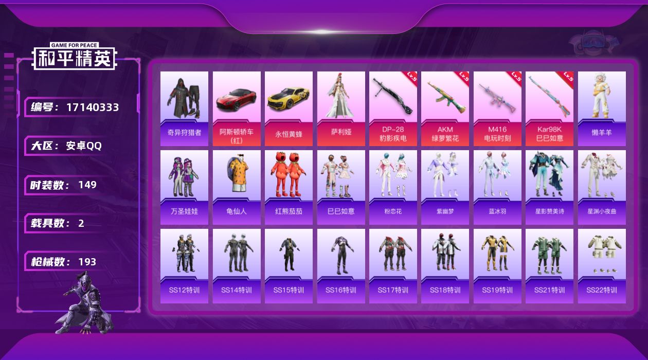 [17140333]安卓 手Q-1粉装-5特效枪-2载具-0粉色飞行器-54565热力值-7王牌印记-149套装-193枪皮