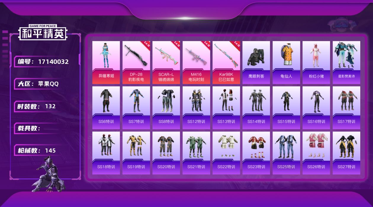 [17140032]苹果 手Q-1粉装-6特效枪-0载具-1粉色飞行器-44796热力值-8王牌印记-132套装-145枪皮 【热门品类】:套装-龟仙人,套装-粉红小猪 【粉色套装】:角色-异瞳寒姬 【粉色枪皮等级】:SCAR-L-锦绣绵绵(五级),M416-电玩时刻(五级),UMP45-萌骑冒险(二级),Kar98K-巳巳如意(五级),Mk14-福马献瑞(二级),DP-28-豹影疾电(五级) 【粉色枪皮】:SCAR-L-锦绣绵绵,M416-电玩时刻,UMP45-萌骑冒险,Kar98K-巳巳如意,Mk14-福马献瑞,DP-28-豹影疾电 【粉色飞行器】:炫彩糖果飞行器 【粉色降落伞】:幻影战神降落伞,彩虹甜喵降落伞,莲影清波降落伞,异瞳寒姬降落伞,极意拳锋降落伞,炫彩糖果降落伞,辉云木星降落伞 【稀有套装】:套装-龟仙人,套装-炫彩糖果,套装-马上有钱,套装-星影赞美诗,角色-曹焱兵 【稀有枪皮】:AUG-冰晶雪宝,AKM-夜灯,AKM-彩虹符号,AKM-破晓战魂,AKM-萌趣颜团子,AKM-虎虎生威,AKM-霓虹街区,AKM-龙的传人,M16A4-幻世战舞者,M16A4-红色方程式,M16A4-蓝色火焰,SCAR-L-夜灯,SCAR-L-炫彩节奏,SCAR-L-玉兔迎春,SCAR-L-红色方程式,M416-糯团青竹,M416-红色方程式,M416-绯红前夜,M416-蓝色火焰,GROZA-彩虹符号,GROZA-田园牧歌,AUG-幻影战神,AUG-耀粉歌者,QBZ-彩虹符号,M762-天降萌叽,M762-牛气冲天,M762-登顶巅峰,AC-VAL-天降萌叽,AC-VAL-快闪甜心,蜜獾-天降萌叽,蜜獾-娇憨猪猪,UZI-啾咪啾咪,UZI-天降萌叽,UZI-娇憨猪猪,UZI-影袭,UZI-红色方程式,UMP45-夜灯,UMP45-生命誓言,UMP45-蓝色火焰,UMP45-极意拳锋,Vector-焰鹰斗篷,Vector-彩虹符号,Vector-生命誓言,Vector-田园牧歌,汤姆逊-天降萌叽,汤姆逊-耀粉歌者,P90-快闪甜心,P90-飞驰魅影,Kar98K-彩虹符号,Kar98K-影袭,Kar98K-炫彩节奏,Kar98K-红色方程式,M24-影袭,AWM-焰鹰斗篷,SKS-夜灯,SKS-炫彩节奏,VSS-田园牧歌,Mini14-炫彩节奏,Mini14-耀粉歌者,Mini14-金鼠