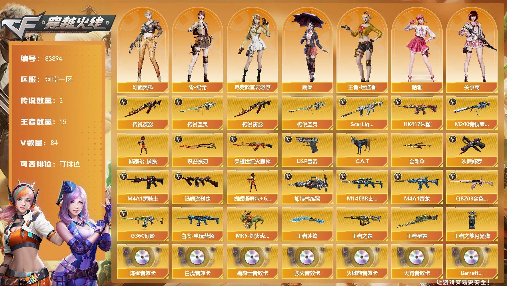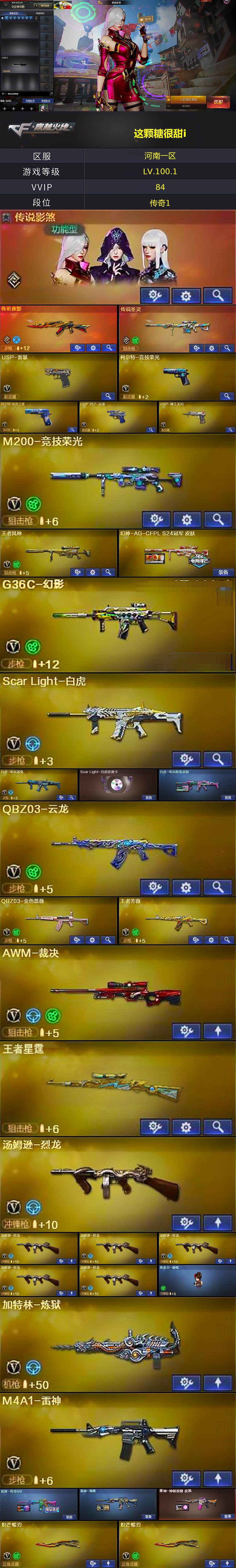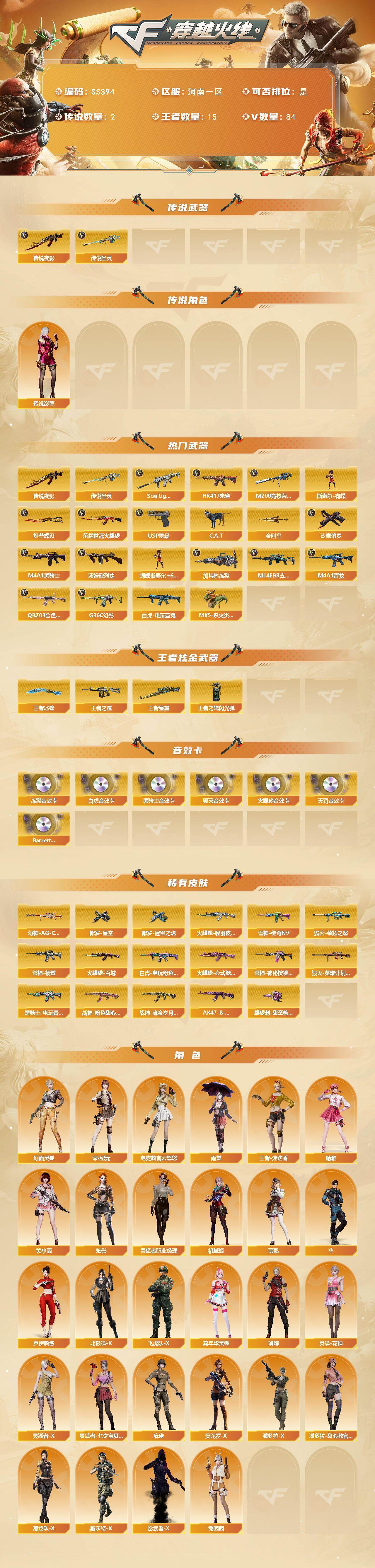 [17380466]河南一区-92V-15王者武器数-0炫金武器数 【传说武器】:传说夜影,传说圣灵 【传说角色】:传说影煞 【热门武器】:传说圣灵,传说夜影,G36C-幻影,QBZ03-金色蔷薇,M14EBR-玄武,Scar Light-白虎,HK417-朱雀,M4A1-青龙,M200-竞技荣光,荣耀世冠-火麒麟,白虎-电玩蓝兔,C.A.T,M4A1-黑骑士,汤姆逊-烈龙*6,加特林-炼狱,斯泰尔-蝴蝶,MK5-炽火炎龙,USP-雷暴,沙鹰-修罗,炽芒蝶刃*2,金刚伞 【王者炫金武器】:王者星霆,王者之霆,王者冰锋,王者之魄闪光弹*2 【音效卡】:AK47-火麒麟音效卡,M4A1-黑骑士音效卡,Barrett-毁灭音效卡,Scar Light-白虎音效卡,QBZ03-天罚音效卡,加特林-炼狱音效卡,Barrett-碧霄极光音效卡 【皮肤】:幻神-AG-CFPL S24冠军 皮肤,白虎-电玩粉兔皮肤,雷神-传奇N9,雷神-杨戬,雷神-神秘按键 皮肤,火麒麟-轻羽皮肤,火麒麟-百城,火麒麟-心动糖果,毁灭-荣耀之怒,毁灭-英雄计划 皮肤,黑骑士-电玩青兔皮肤,战神-粉色甜心皮肤,战神-流金岁月皮肤,AK47-B-常胜将军-曹操,修罗-星空*2,修罗-冠军之魂,麒麟刺-甜蜜糖果 皮肤 【角色】:魅影,雨棠,电竞教官-云悠悠,关小雨,晴雅,雨墨,机械姬,华,零·纪元,王者-迷迭香,乔伊教练,幻面灵狐,北极狐-X,飞虎队-X,嘉年华灵狐,娟娟,灵狐-花神,灵狐者-X,灵狐者-七夕宝贝,灵狐者-职业经理,麻雀,曼陀罗-X,潘多拉-X,潘多拉-甜心教官,潜龙队-X,斯沃特-X,兔囡囡,影武者-X 【人偶武器】:星神-炽天使,MK5-炽火炎龙,斯泰尔-蝴蝶,Scar Light-马枪,C.A.T,迷你裂空之翼,迷你波特博士,迷你生化手雷*4,生化手雷-机甲核心,M37-奇洋探员,COP-青花瓷-斯沃特精英,迷你超能女侍 【暴走生化】:双面神,超级对讲机 【挑战大师】:冰龙粉碎者-白马银枪,激光毁灭者III-白马银枪*3,试炼破坏者III,神圣爆裂者-末日III 【英雄级武器】:AK47-火麒麟*2,M4A1-雷神,M4A1-黑骑士,M4A1-青龙,HK417-朱雀,Scar Light-白虎,M14EBR-玄武,QBZ03-天罚,无影-神兵利器,G36C-幻影,QBZ03-云龙,QBZ03-金色蔷