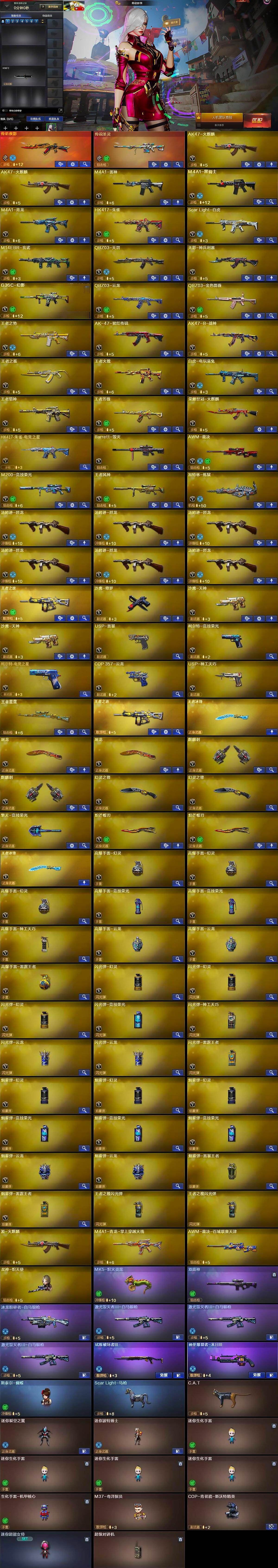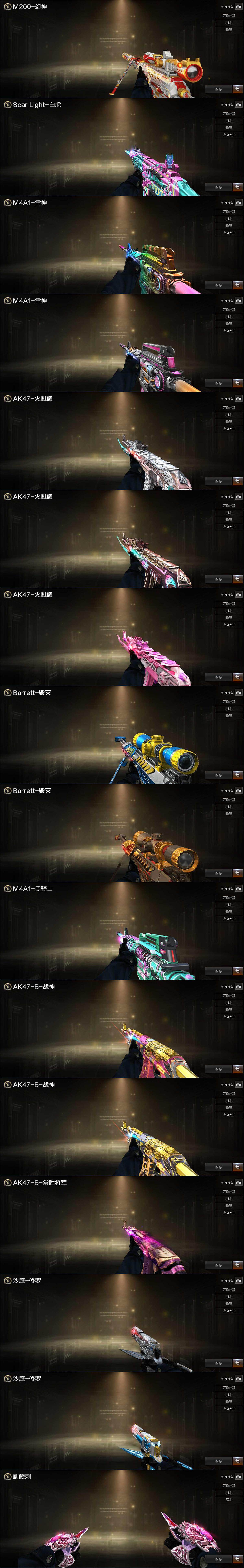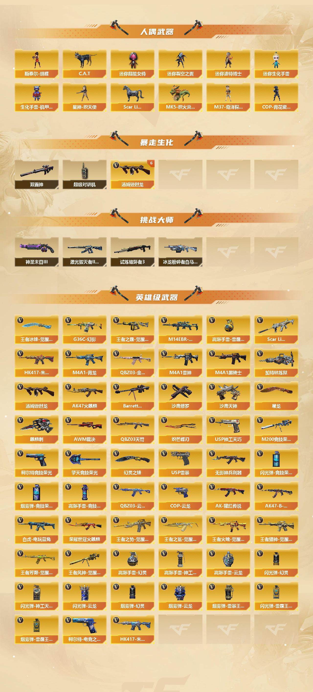 【英雄级武器】:AK47-火麒麟*2,M4A1-雷神,M4A1-黑骑士,M4A1-青龙,HK417-朱雀,Scar Light-白虎,M14EBR-玄武,QBZ03-天罚,无影-神兵利器,G36C-幻影,QBZ03-云龙,QBZ03-金色蔷